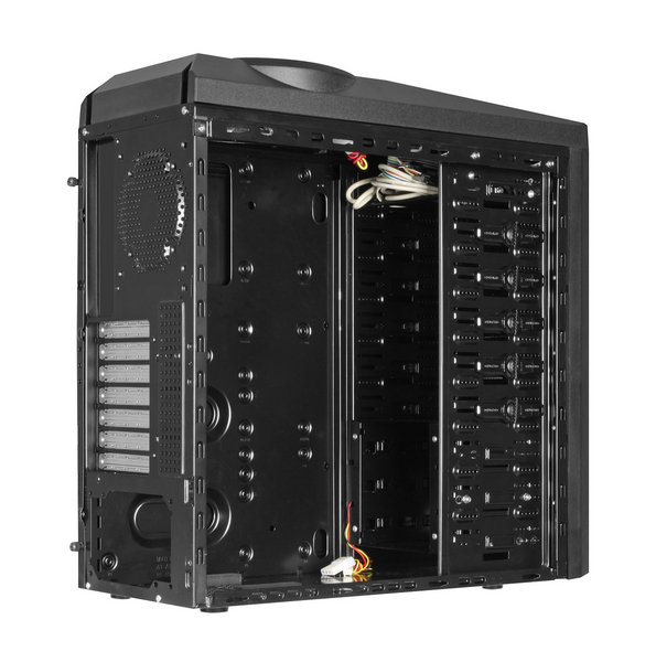 Il Bandit Sharkoon è costruito con robusto acciaio SECC con finitura nera sia all'interno che all'esterno. Dietro le maschere frontali in plastica, che sono costruite con un disegno a griglia per un'ottimale passaggio dell'aria, si trova l'alloggiamento per cinque unità ottiche e tre dischi fissi. Questi ultimi sono raffreddati da una ventola da 120 millimetri preinstallata in una slitta rimovibile dedicata proprio ai dischi rigidi. Le unità ottiche possono essere installate senza attrezzi grazie a meccanismi di blocco/sblocco facilitati. La zona CPU presenta un'apertura che facilita la sostituzione del dissipatore senza smontare la scheda madre e il sistema di gestione dei cavi nascosti che intercorre tra la staffa della scheda madre e i pannelli laterali garantisce una migliore circolazione dell'aria in tutto il case.