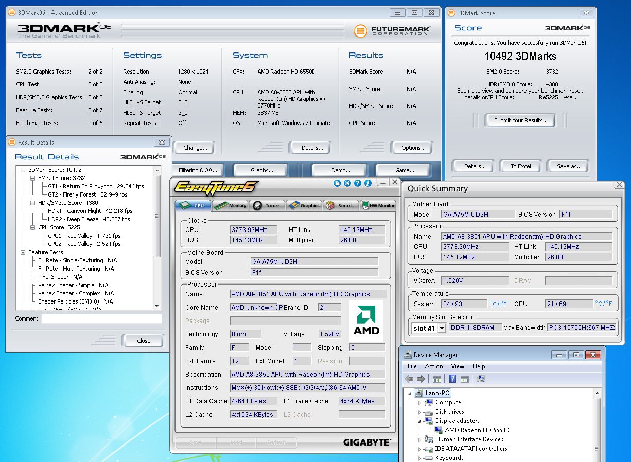 E 'importante notare come i core dellaa CPU sono stati overcloccato a 3,773 GHz (145,13 x 26,0 MHz), con una tensione di 1.52V. Le memorie usate nel test erano delle dual-channel DDR-3 1333 MHz anche se la l' APU supporta le più veloci DDR-3 1866 MHz.