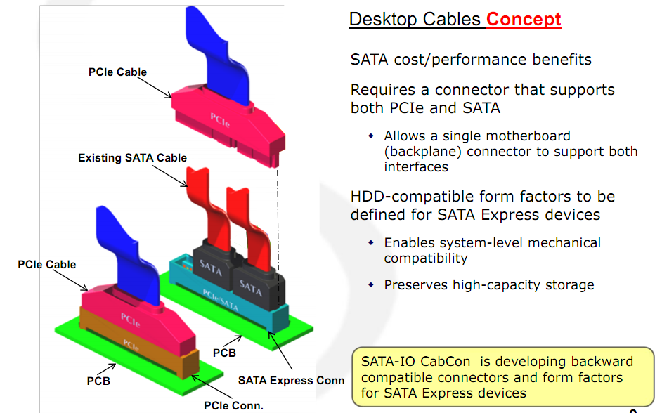 L'unità storage, negli ultimi anni, ha avuto un incremento prestazionale molto elevato, fornito soprattutto dai dischi a stato solido. Gli SSD con le loro velocità di trasferimento elevatissime stanno satureranno la banda passante della connessione SATA 3 (6Gb/s), affermatasi in tempi recenti.SATA-IO ha deciso di introdurre una nuova connessione, che combina la struttura SATA con la connessione PCI Express, in grado quindi di fornire un'interfaccia ad elevata velocità mantenendo bassi i costi di produzione. La nuova connessione SATA Express raggiungerà le velocità di 8Gb/s e 16Gb/s.