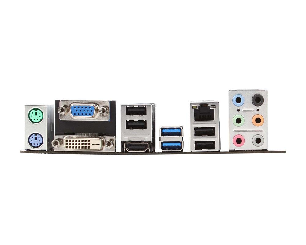 Nel pannello posteriore figurano: due porte PS/2, una D-Sub, una DVI-D, una HDMI 1.4, quattro porte USB 2.0, due USB 3.0, una porta LAN gestita dal controller Realtek RTL811E e sei jack audio, per uscita ad 8 canali, con controller Realtek ALC892.