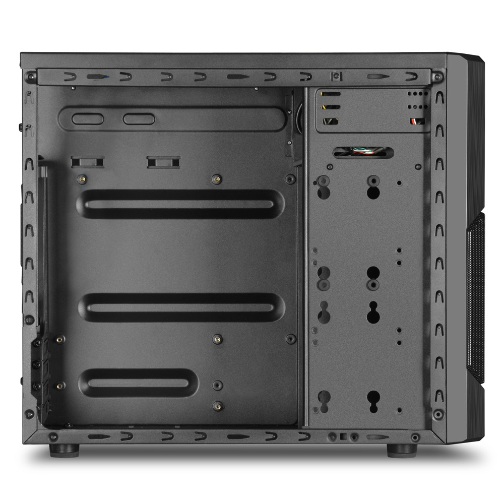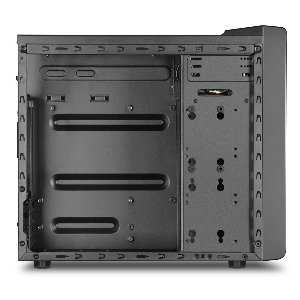 Sul pannello frontale, i case mettono a disposizione due drive bay, uno da 3,5" ed uno da 5,25". Le pote I/O sono composte da tre USB 2.0, una USB 3.0 e due connessioni audio.