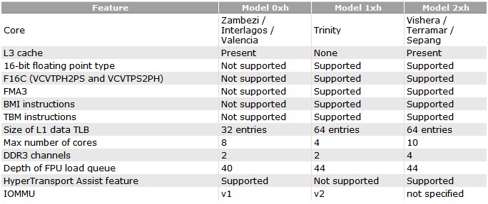 CPU World ha riassunto tali specifiche nella seguente tabella comparandole anche alle nuove APU Trinity, anch'esse basate su core Piledriver e previste per il secondo trimestre di quest'anno.