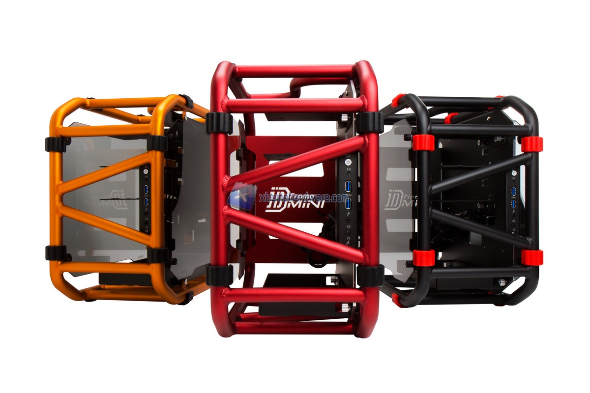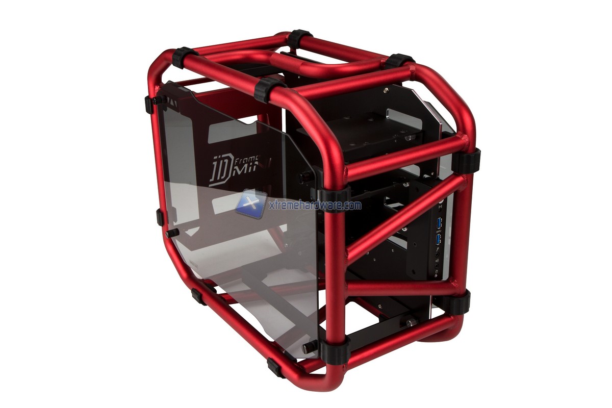 Partiamo subito dal nuovissimo D-Frame Mini modello ITX del fratello maggiore D-Frame. Il nuovo D-Frame riprende la linea ed il design del D-Frame con la semplice differenza nel formato. Il D-Frame Mini ospita soltanto schede madri in formato Mini-ITX ma e` comunque dotato di caratteristiche che lo rendono un case di fascia alta come ad esempio la possibilita` di installare alimentatori fino a 220 millimetri (quindi anche modelli di fascia alta), schede video high-end o ancora dissipatori AIO o radiatori da 240 millimetri. Il design del D-Frame Mini e` unico come quello del D-Frame. La struttura e` interamente in tubolari di alluminio e di tipo Open Frame con pannelli laterali in acrilico fume` per rendere il case o diciamo questa opera d'arte unica. I colori che abbiamo visto sono stati Nero,Rosso, Oro e Bianco. Il D-Frame Mini e` dotato anche di due porte USB 3.0 e unita` da 3,5" trasformabili in unita` da 2,5".