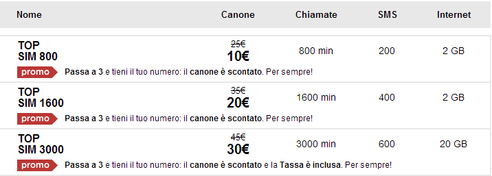 Le offerte in abbonamento di TRE sono cambiate rispetto al mese precedente. Ora prevedono più minuti ad un costo decisamente inferiore e sono convenienti se si intende portare il proprio numero a TRE. Nota importante: come per le ricaricabili Le soglie di minuti ed SMS inclusi prevedono dei massimali settimanali. Al prezzo finale dell’abbonamento deve essere aggiunta la Tassa di concessione governativa pari a 5.16€ per uso personale e 12.91€ per uso affari.