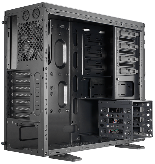 Il nuovo  Vs-4 rappresenta il perfetto connubio tra espandibilità, versatilità e prezzo contenuto. Proposto con una colorazione nera sia all’esterno che all’interno, questo chassis si contraddistingue per l’utilizzo di materiali di alto livello ed è realizzato in acciaio giapponese SECC da 0,5mm di spessore. Una delle caratteristiche più innovative di questo case è senz’altro il cestello di fissaggio dei dischi fissi, che può essere orientato in 3 direzioni, per ottimizzare al meglio la dissipazione interna. Interessante inoltre lo spazio posteriore in corrispondenza della CPU ricavato sulla piastra di fissaggio della scheda madre, che semplifica l’installazione di dissipatori di grandi dimensioni.
