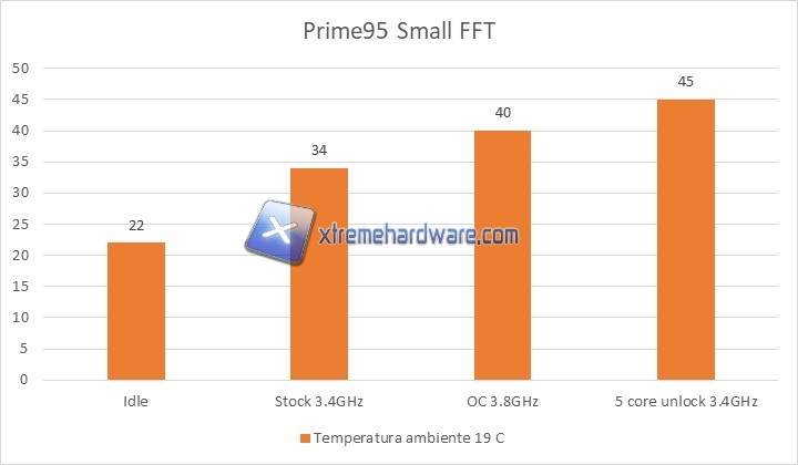 Come ultima nota, nel caso le temperature riportate vi sembrassero eccessivamente basse, vi ricordiamo che i vecchi Phenom II x4 di AMD erano CPU con valori massimi di temperatura molto ridotti, intorno ai 60 gradi centigradi. Mantenere i core, anche in overclock, ad un massimo di 40/45 gradi C è indice di ottime prestazioni e di un buon margine anche in vista del periodo estivo ove, con una temperatura ambiente maggiore, ci si aggirerà su temperature di circa 10 gradi C più alte; valore perfettamente compatibile con un massimo ipotetico fissato intorno ai 60 C.