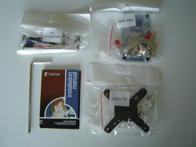 In particolare troviamo le staffe per socket LGA 775 e per AM2 (quelle per AMD 754, 939, 940 sono acquistabili separatamente). Le staffe sono raccolte in due bustine con chiusura adesiva ed etichettate, facilmente richiudibili e riutilizzabili. Una terza bustina contiene le clip per il montaggio della ventola al dissipatore, degli adattatori per l'attacco della ventola che consentono di diminuire il regime di rotazione della stessa, un tubetto di pasta termoconduttiva (NT-H1), delle strisce di gomma per assorbire le vibrazioni della ventola e delle parti necessarie per l'assemblaggio di entrambi i kit.