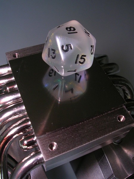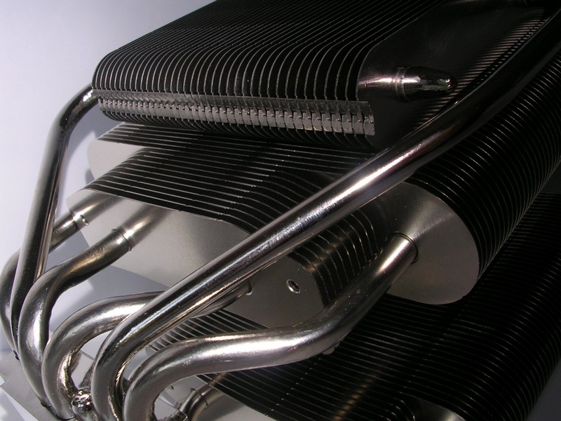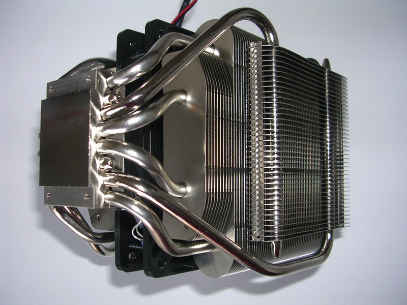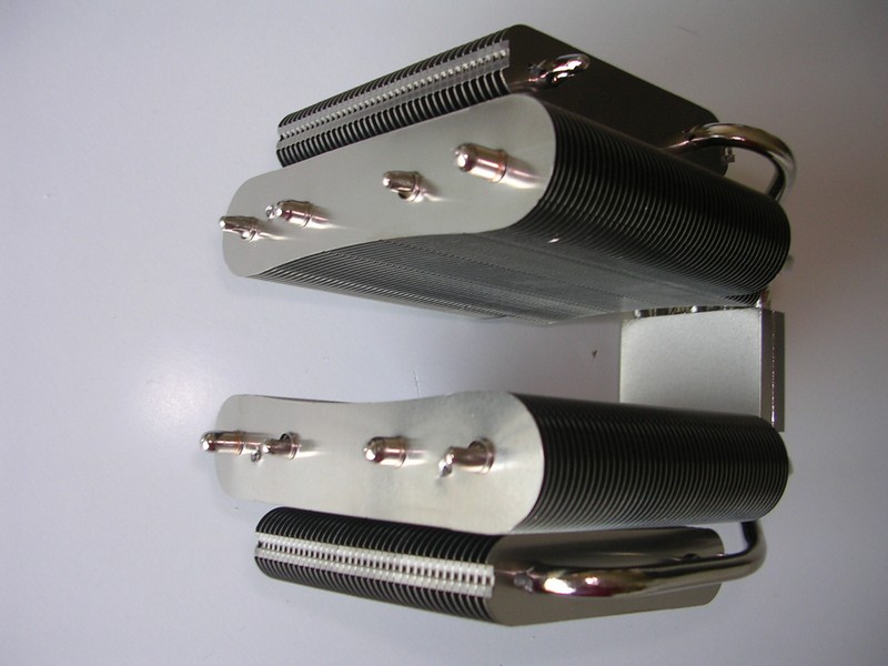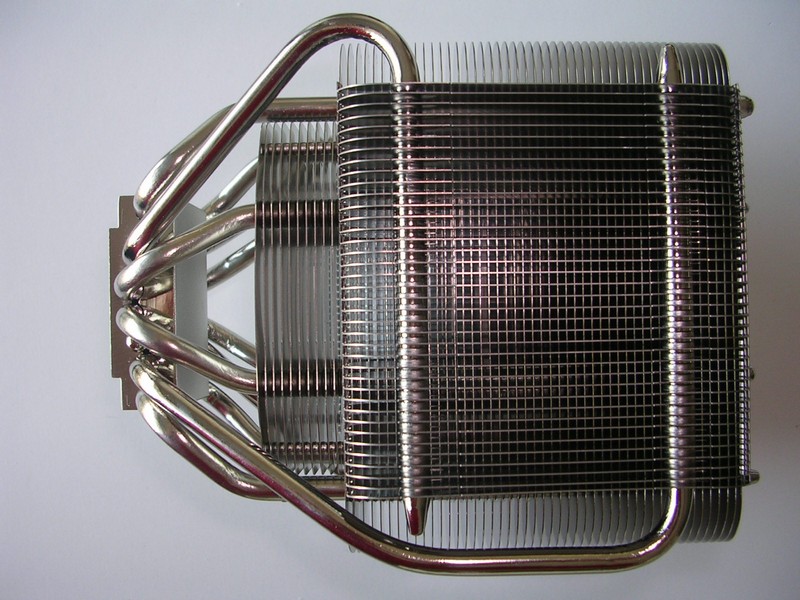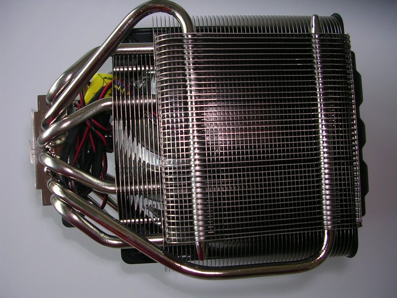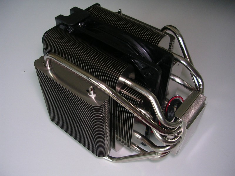 Di solito il peso è uno dei parametri che consente rozzamente di stimare le potenzialità di un dissipatore. I suoi 865 g mostrano che c'è molta “sostanza” in questo dissipatore. Anche se sembra piuttosto compatto grazie alla forma a parallelepipedo, è in realtà un po' ingombrante specie in altezza, dove 16,1 cm sono un po' troppi per permetterne l'installazione nei case più stretti. Le altre due dimensioni di 12 e 12,5 cm non sono invece di alcun impaccio all'interno del case. La base è in rame ed è stata nickelata, come del resto tutte le altre parti del dissipatore (cioè le heatpipes in rame e le alette in alluminio), regalando al dissipatore un aspetto lucente ed elegante. La lappatura è davvero ottima mostrando una superficie praticamente a specchio. Dalla base si dipartono le 8 heatpipes di cui 4 piegate a “U” e altre 4 terminanti nella base. Visto che disporre 8 heatpipes parallelamente alla base sarebbe stato impossibile, la superficie lungo cui sono disposte è leggermente incurvata.
