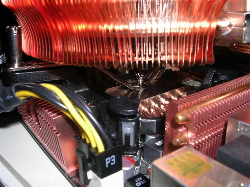 Il montaggio di questo dissipatore è davvero particolare. E' previsto infatti un particolare sistema di fissaggio che va a ricreare un castelletto simile a quello di casa AMD. Questo castelletto è realizzato con un quadrato di plastica su cui vanno infilati quattro push-pin (del tutto simili a quelli del dissipatore stock intel) con cui agganciarlo alla scheda madre. Una volta posizionata la pasta termica sul processore, il dissipatore va agganciato a una parte del castelletto e poi fissato alla vite che fuoriesce dall'altra estremità del castelletto, il tutto grazie a una particolare staffa basculante fissata sulla sommità della base. Sebbene questo procedimento sembri piuttosto macchinoso, l'installazione non richiede moltissimo tempo ed è abbastanza facile tecnicamente richiedendo l'utilizzo si una sola vite (o meglio un bulloncino con testa a croce). Anche il sistema di ancoraggio sembra buono e dovrebbe garantire un buon contatto tra cpu e base del dissipatore. Unica nota stridente è sull'estremità del castelletto che sporge e che serve ad avvitare la staffa. Durante le fasi di montaggio infatti questa parte andava a toccare sui dissipatori del chipset o dei mosfet intorno al socket e non si riusciva ad agganciarlo alla scheda madre tramite i push pin. Alla fine piegando un po' il dissipatore dei mosfet a nord del socket siamo riusciti a installare correttamente il castelletto. Il problema come si può notare anche dalla foto non è l'altezza ma lo spazio esiguo in larghezza intorno al socket.