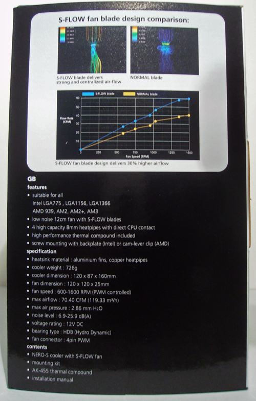 Il dissipatore è alloggiato in una scatola scura di cartonedove sul fronte è visibile l’immagine del prodotto e alcune sue caratteristiche tecniche, approfondite più dettagliatamente sui lati della confezione. Aprendola troviamo l’Akasa Nero-S ed una scatola con le istruzioni e il relativo kit di montaggio per entrambi i socket.