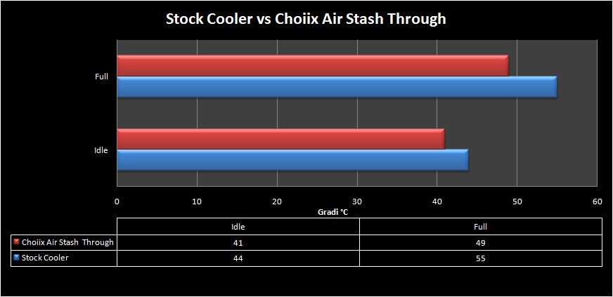 Come si può notare dal grafico sovrastante il portatile non scalda molto e mantiene temperature di esercizio piuttosto contenute. Senza la base ventilante raggiungiamo in idle 44°C e in full-load 55°C. Usando la Choiix Air Through Stash riusciamo ad abbassare la temperatura in idle di 3°C, raggiungendo i 41°C, mentre in full-load riusciamo a guadagnare ben 6°C, portando la temperatura non oltre i 49°C.
