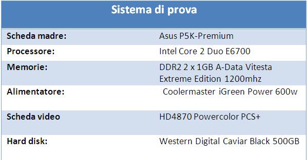 Abbiamo testato il dissipatore sul seguente sistema, montato su un banchetto, con temperatura ambiente di circa 25°C: