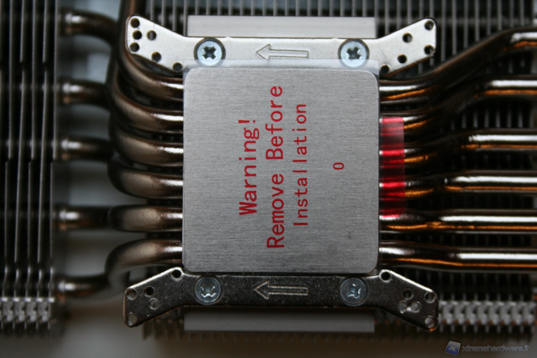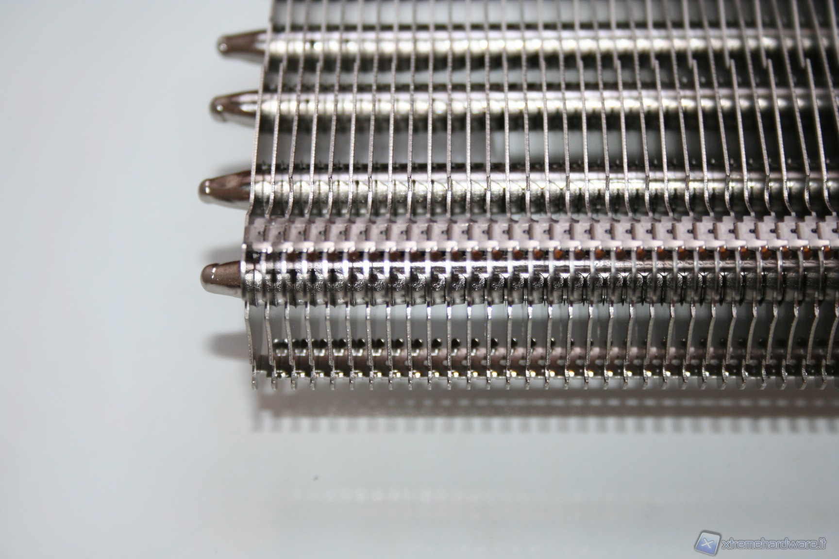 L’ottima nichelatura del rame, sia delle heatpipe, sia della base, oltre ad essere molto piacevole allo sguardo è sinonimo dell’elevatissima qualità costruttiva di quest’unità. Le 12 heatpipe partono dalla base e suddividono il dissipatore in due blocchi principali. Inoltre le alette interne hanno una particolare struttura che sebbene non aumenti di molto la superficie dissipante, permette di ottenere risultati migliori con ventole aventi una minore pressione statica, quindi nel complesso temperature migliori con ventole più silenziose; ovviamente però maggiore è la velocità di rotazione e migliori saranno i risultati complessivi. Se riuscirà a tenere a bada una GTX 480 con solo due ventole da 1100 RPM e 61 CFM saremo dinanzi ad un prodotto molto interessante. La distanza tra le alette è 1.8 mm, che comparata ad altri dissipatori in commercio è elevata. I due blocchi sono ripartiti in 49 e 35 alette, aventi 6 heatpipe ciascuno. Buona la finitura della base, anche se non è lucidata a specchio.