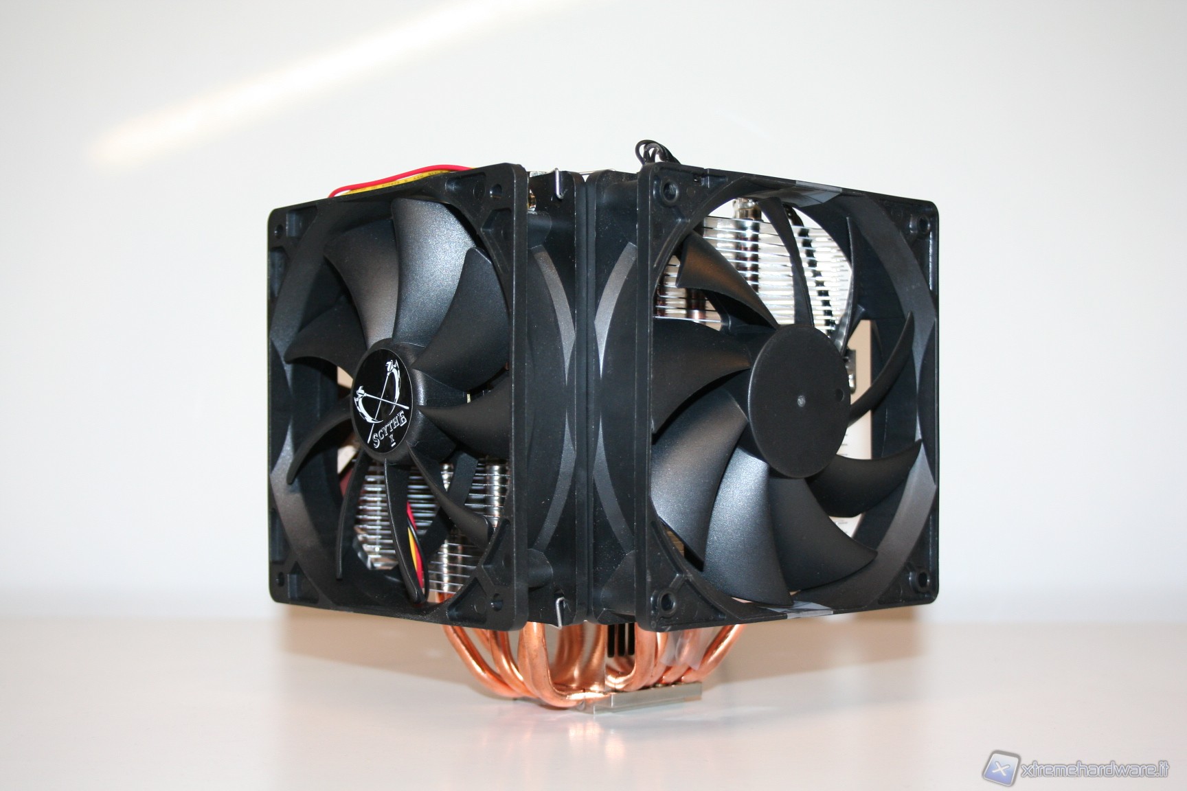 Considerando le possibilità intrinseche di questo dissipatore abbiamo pensato che sarebbe stato interessante testarlo anche con più ventole lateralmente. E’ stata usata una configurazione avente tre ventole Scythe Slip Stream da 800RPM con posizionamento in Push, sinistro e destro, mentre in pull non è stata posizionata nessuna ventola, per evitare di ostruire il passaggio dell’aria e quindi potenzialmente compromettere i flussi generati dalle tre ventole. Ricordiamo che sarebbe possibile eventualmente montarne 4 ma consigliamo al massimo di metterne solamente tre, in PUSH+2laterali oppure PULL+2laterali. Purtroppo, e ci scusiamo per l’inconveniente, non ci è stato possibile mettere le foto del Ninja 3 con le 3 ventole Slip Stream, poiché, a causa di un errore tecnico, sono andate perdute. A titolo puramente illustrativo vi mostriamo la stessa configurazione 3x Push ma con ventole diverse.