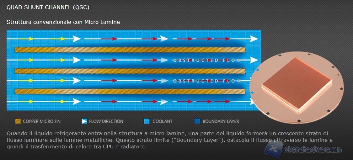 In seguito ad un attento studio di fluidodinamica, Enermax ha deciso, di introdurre delle scanalature ortogonali, ai microcanali del waterblock, al fine di migliorare il flusso attraverso lo stesso e di conseguenza lo scambio termico con la CPU.