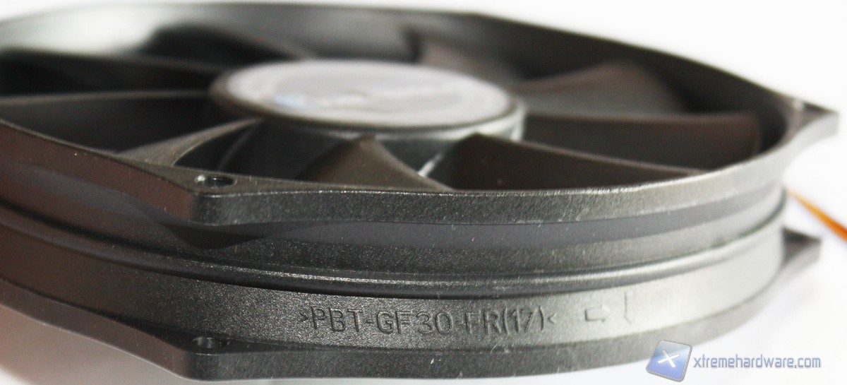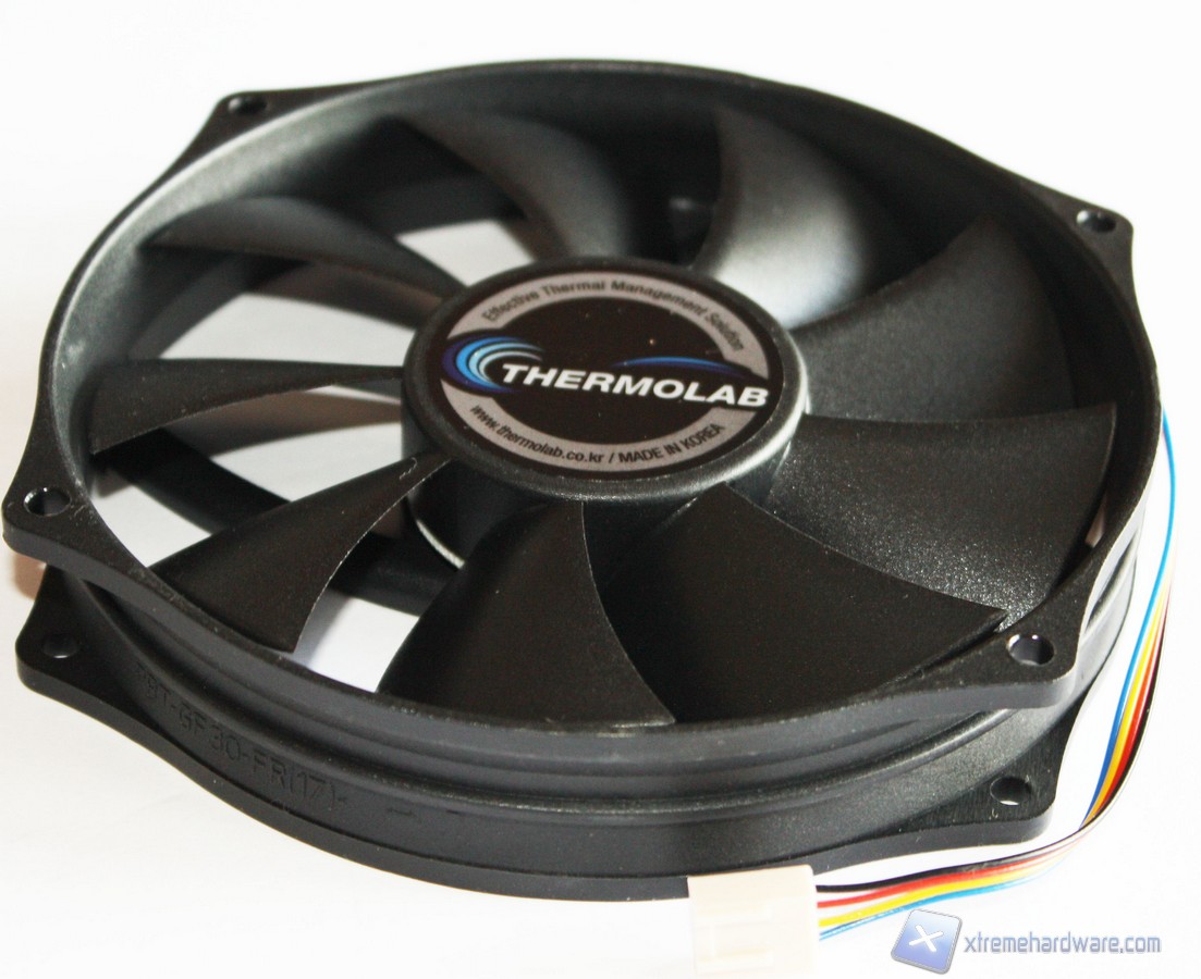 Detto questo passiamo all’analisi del modello ADDA AR1212LX-A9BGL. La ventola in dotazione al Trinity è come detto da 130 mm ed appartiene alla tipologia PWM. La colorazione è la classica nera per l’intero corpo. Il connettore PWM a 4 pin permetterà di variare la velocità di rotazione, in maniera automatica, in base al carico della CPU. Il cavo del connettore PWM non è rivestito in treccia di tessuto ma per la tipologia e la destinazione di utilizzo non è strettamente necessario. Il disegno non è classico ma ha una forma circolare. Questo potrebbe portarvi a pensare che non sia possibile cambiarla, invece il modello in oggetto misura 130 mm solo per quanto riguarda il diametro ma i fori riprendono quelli di una classica 120 mm, quindi nel caso si volesse sostituire la ventola in dotazione con una a vostro piacimento ciò sarà possibile senza problemi. Le pale di tale ventola hanno un profilo classico. La ventola è ancorata saldamente al dissipatore tramite quattro supporti in gomma antivibrazione che quindi hanno la doppia funzione di non intaccare la struttura lamellare con eventuali viti e di ridurre al minimo le vibrazioni generate al massimo dei giri.Facciamo notare che Thermolab non ha previsto la possibilità di installare una seconda ventola in pull, oppure di rialzare la ventola anteriore ma avremo modo comunque di sostituire quella pre-installata con una classica 120 millemetri. Tali modifiche non saranno pertanto facili da effettuare, ma saranno tutto sommato inutili dato che il Trinity è stato studiato per funzionare al meglio in questa modalità.