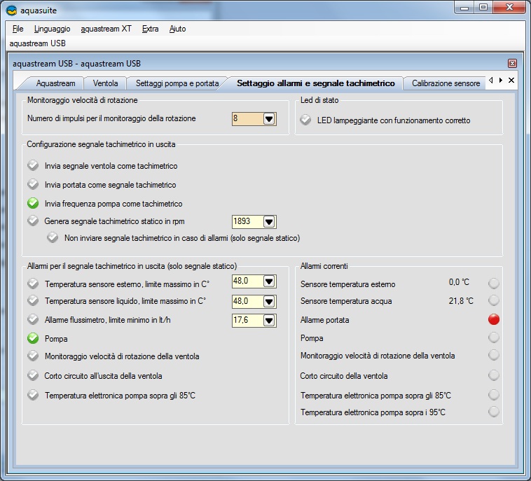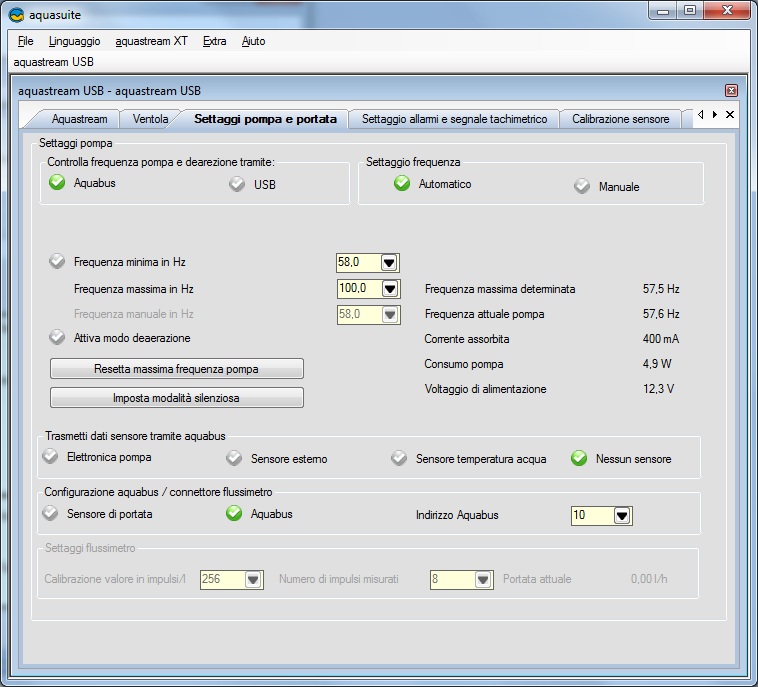 Qui sceglieremo nel riquadro in alto a sinistra la gestione della pompa tramite un controller esterno da acquistare a parte, prodotto dalla casa, per l’appunto l’Aquabus, oppure la gestione tramite USB. Nel riquadro Settaggio Frequenza, sceglieremo se lasciare impostata la gestione automatica oppure manuale della pompa. In quest’ultimo caso di seguito dovremo impostare i vari parametri desiderati. Importante anche il tasto per attivare la modalità de-aerazione. Nel riquadro Trasmetti Dati Sensore tramite Aquabus, vi è la configurazione tramite i vari sensori messi a disposizione dal controller esterno Aquabus e la calibrazione del Flussimetro.