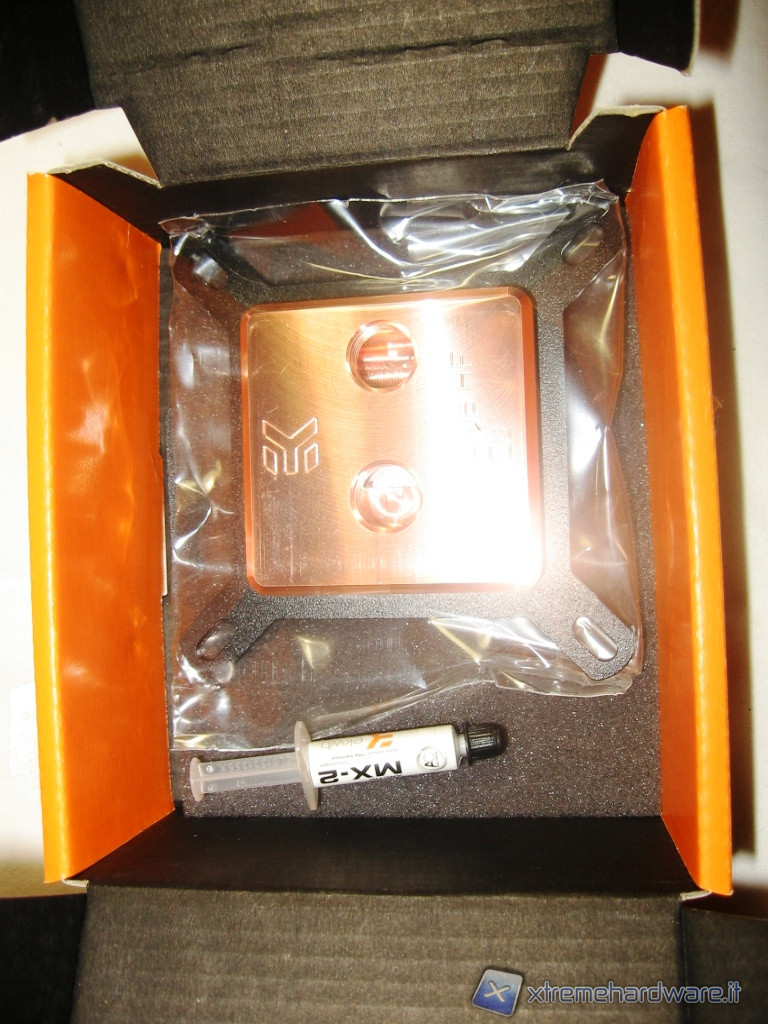 A seguire, troviamo il waterblock protetto da una spugna poliuretanica che lo protegge dagli urti oltre ad essere racchiuso in una bustina trasparente atta a proteggerlo dagli agenti atmosferici sempre pronti ad intaccare il rame ossidandolo. E’ presente inoltre la classica bustina che racchiude la viteria e le staffe di fissaggio e per finire una confezione di pasta termoconduttiva di qualità, parliamo della Artic Cooling MX-2. Dalle foto potete vedere quanto descritto.