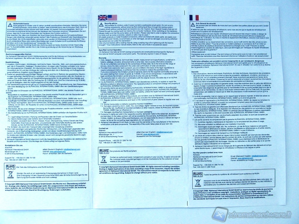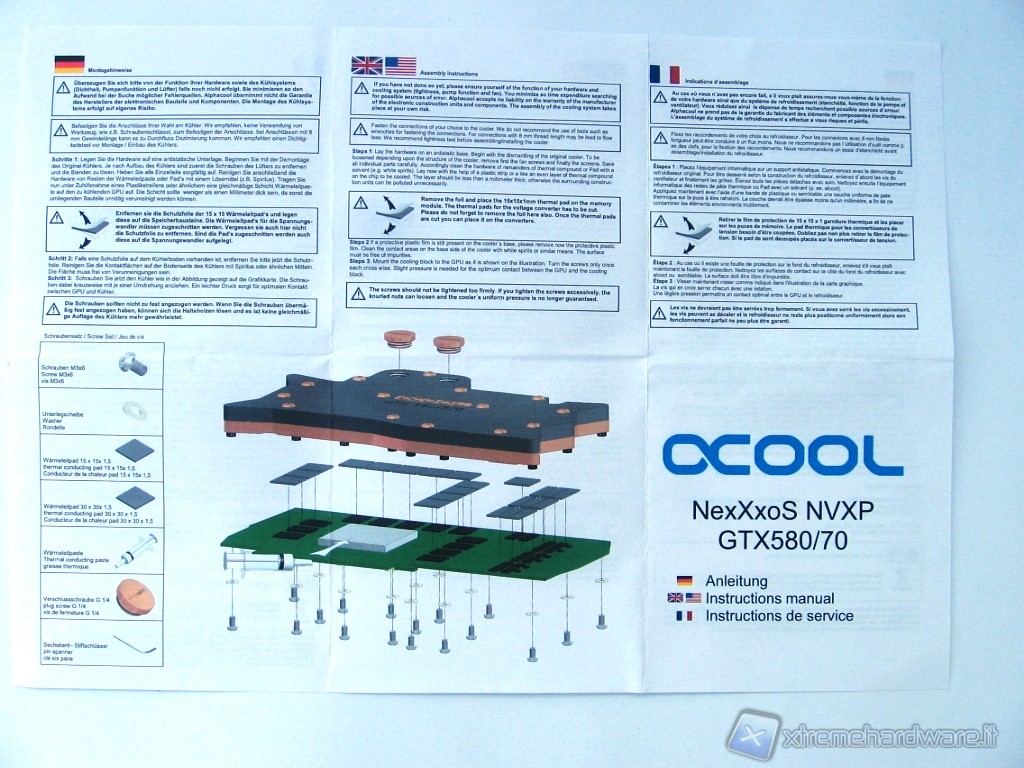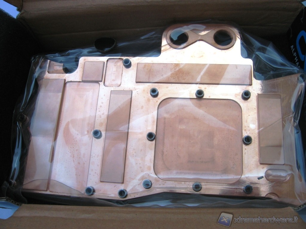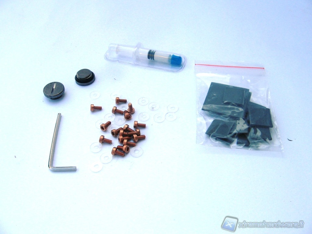 Oltre a questo troviamo pezzi di Pad Termico per il contatto del waterblock con i vari chip di RAM e di alimentazione sparsi sul PCB della VGA. Non ultima una siringa di pasta termica da spalmare sulla GPU per favorire il perfetto contatto e trasferimento del calore al waterblock e 2 tappi che vanno utilizzati nel caso di una sola VGA.