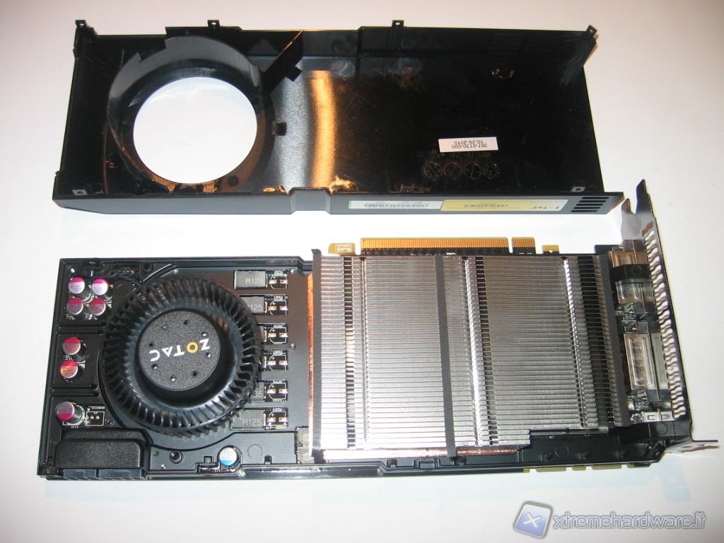 Con una leggera pressione, delicatamente, dovrebbe venir via lo scheletro in metallo. Esso ha una duplice funzione: da un lato provvede al raffreddamento dei vari chip di RAM e di alimentazione mentre dall’altro ha l’importantissima funzione di sostegno, per evitare eventuali torsioni che potrebbero danneggiare la scheda video.