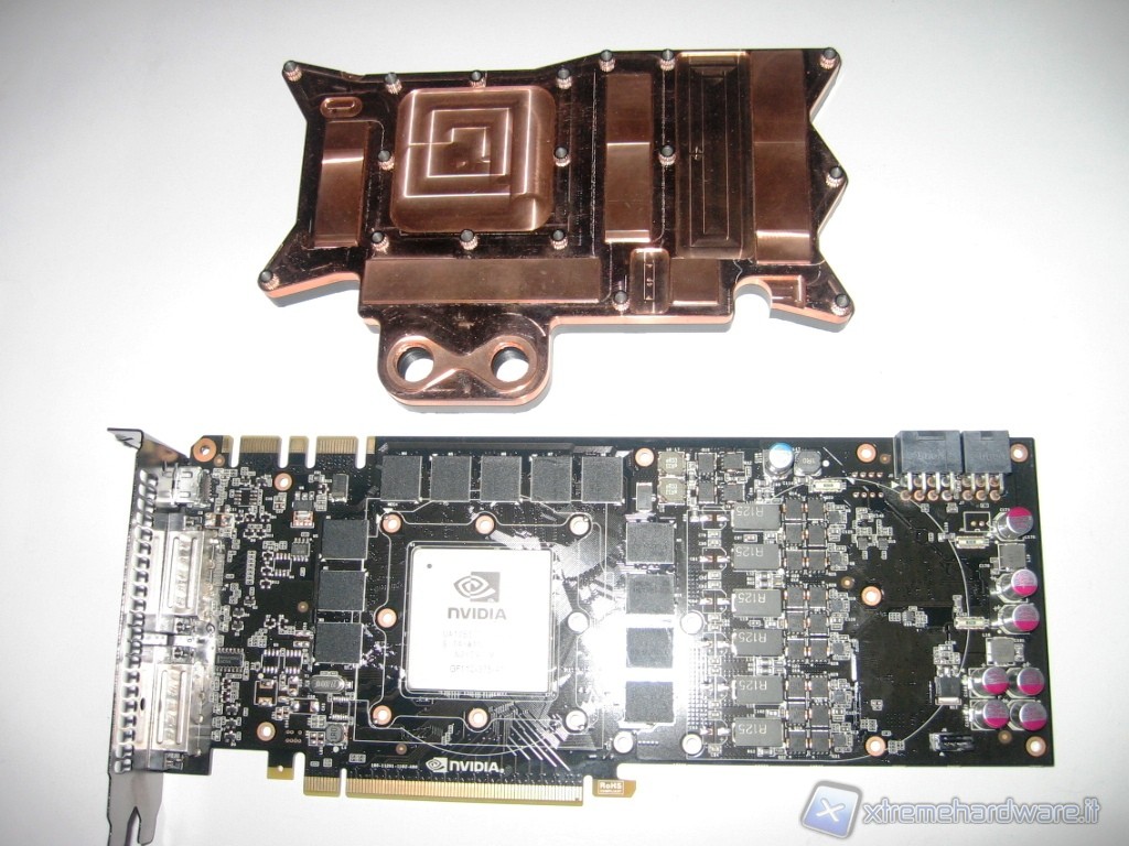 Ed ecco come risulta la scheda video accoppiata al waterblock Alphacool NexXxos NVXP GTX580/70. I 2 tappi in dotazione servono per chiudere 2 dei 4 fori, nel caso si abbia una sola scheda video da inserire nel circuito di raffreddamento a liquido. Dopo aver spurgato l’impianto dall’aria e controllato che non ci fossero perdite di liquido, abbiamo inserito la scheda video nello slot PCI-E della motherboard ed avviato il nostro PC.