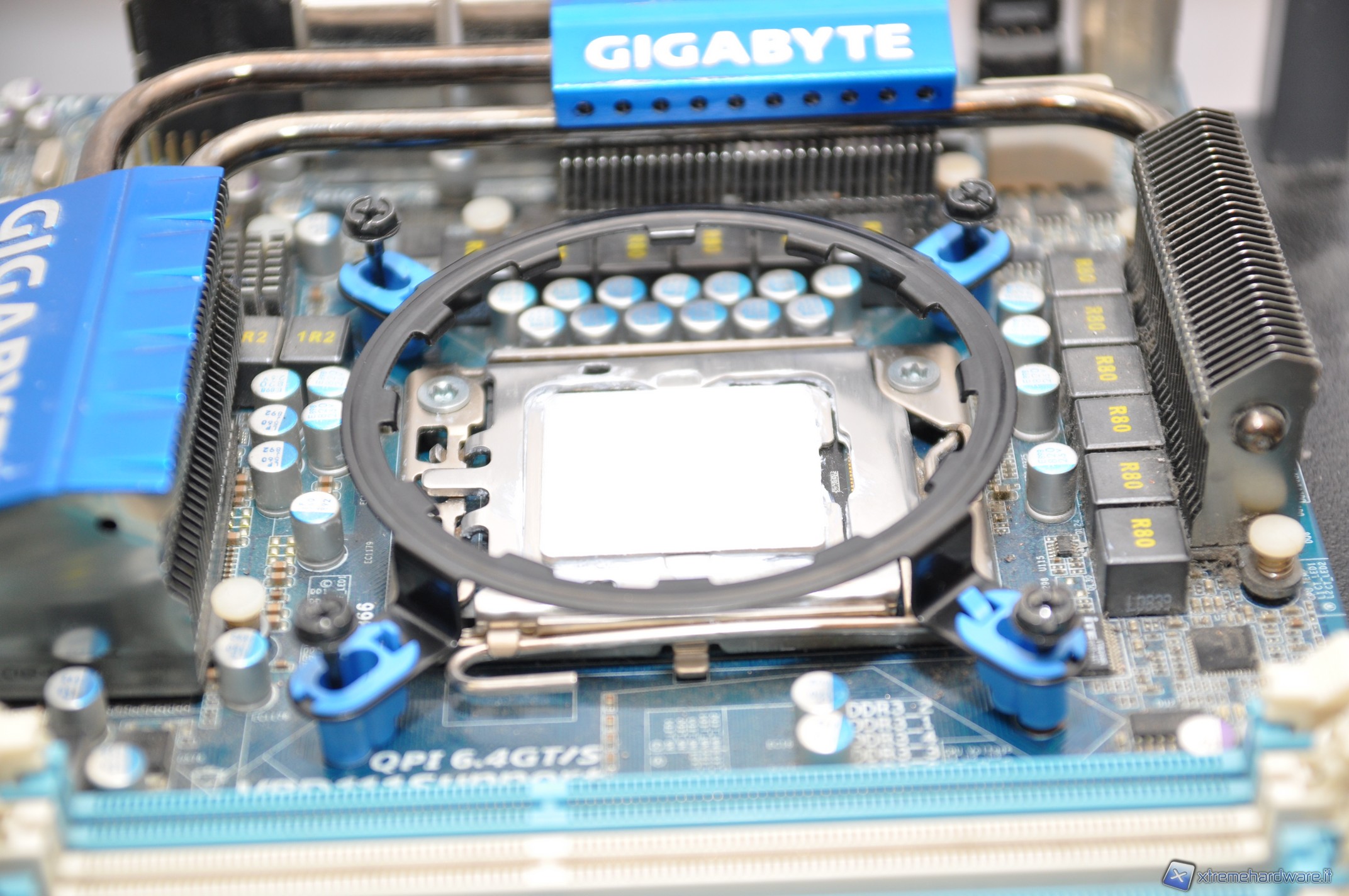 Poi posizioniamo la staffa anteriore, facendo attenzione a piazzare correttamente i bloccanti di colore blu per i socket INTEL. Serriamo ora le viti quel tanto che basta per tenere la struttura ancorata.