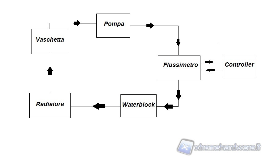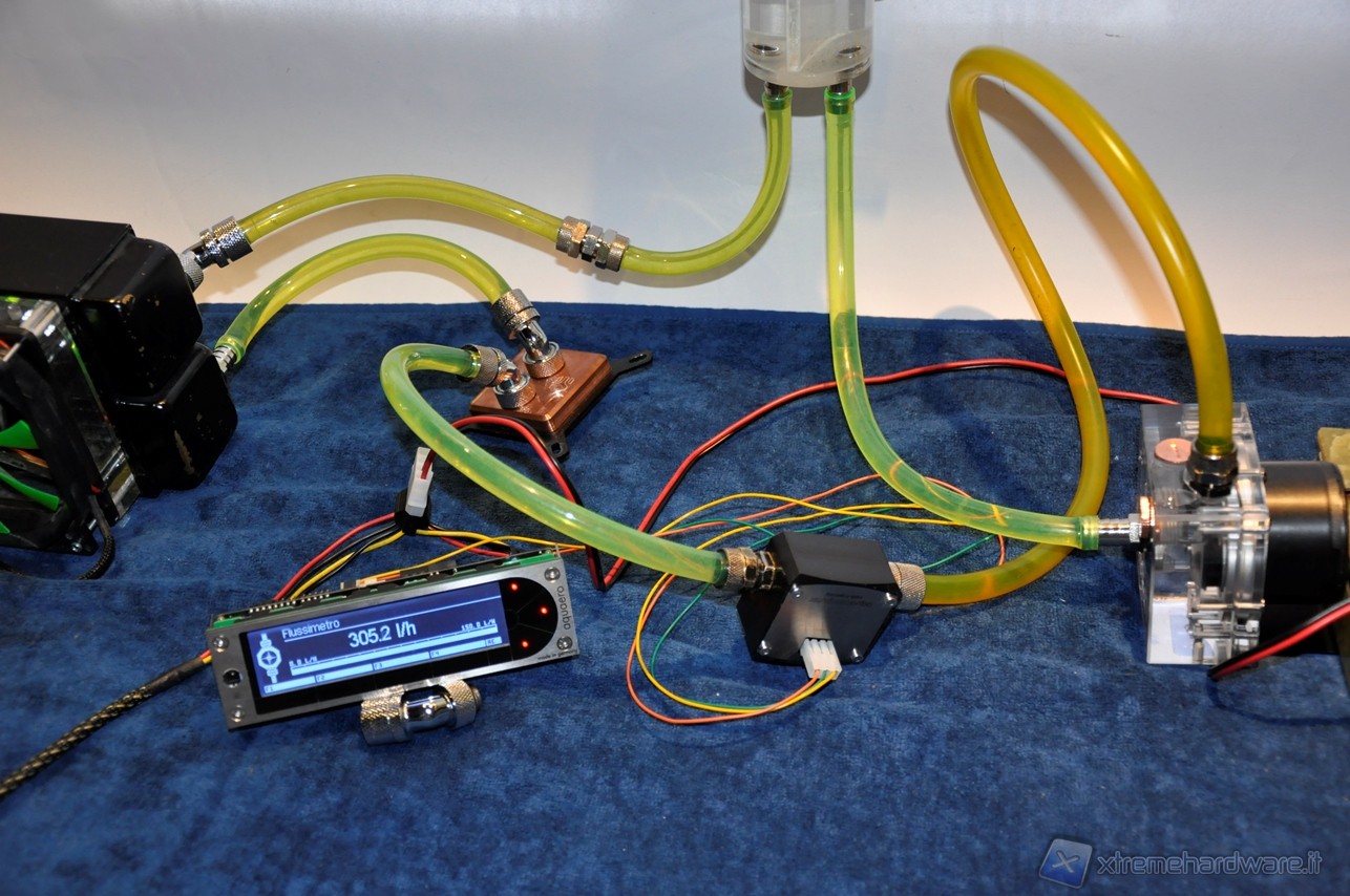 La Alphacool VPP655 corredata di HF Top Plexi D5 si è posizionata nella fascia media, battendo la Phobya DC400 ma non la Swiftech MCP355, avvantaggiata dal TOP Reservoir della XSPC. Abbiamo quindi aggiunto al circuito altri 2 waterblock per sovraccaricare ulteriormente il lavoro delle pompe e vedere come scalano in prestazioni. Lo schema è il seguente: