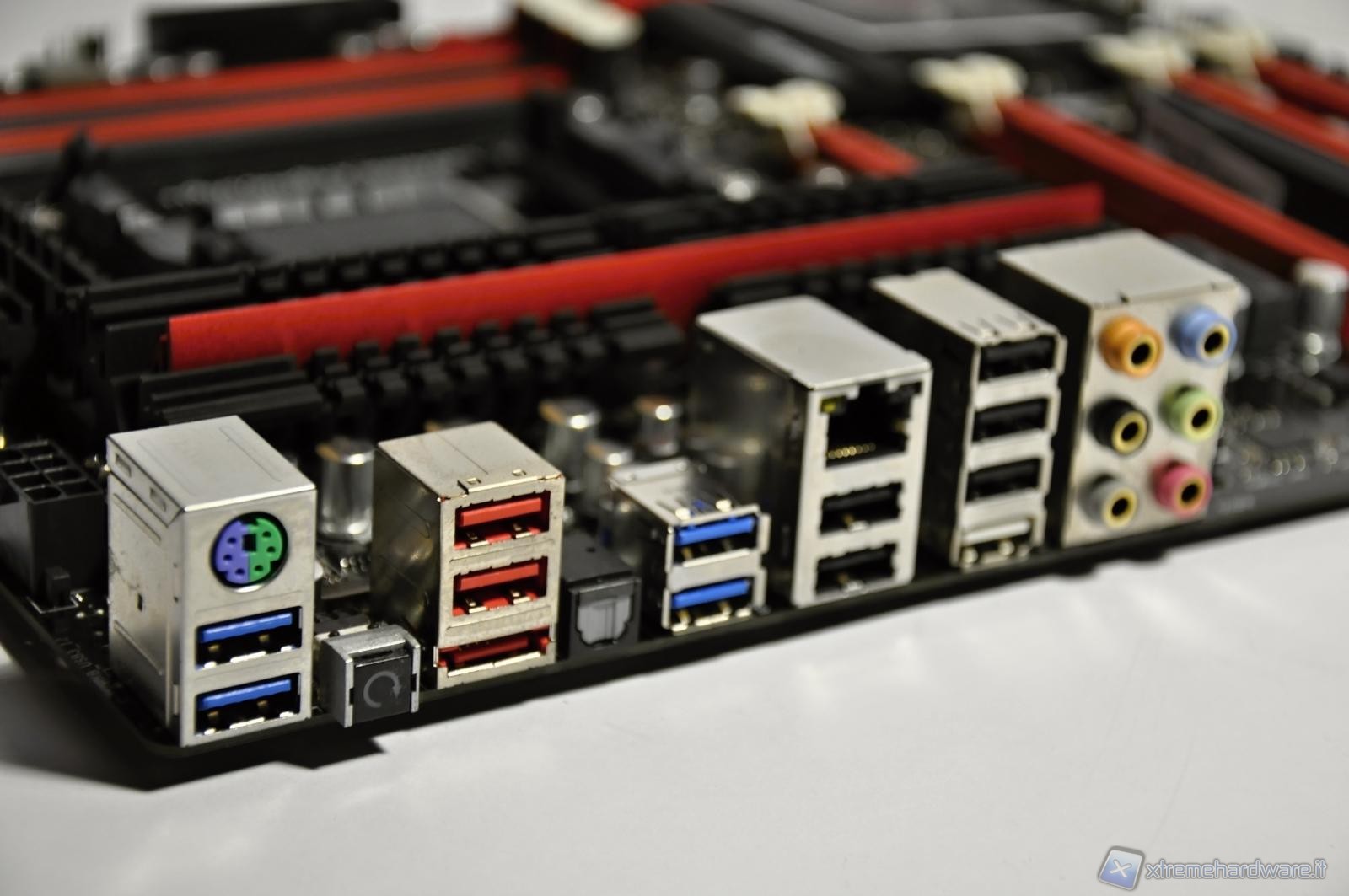 The number of USB ports is remarkable, distinguished by color depending on the speed of connection and origin. One of the black ports, can be converted for use with ROG Connect, while we note the absence of a FireWire port and a second LAN port. Instead, from left, below the 2 USB ports group we have 1 e-SATA port. To end the blockade of ports, all the I/O sockets reserved for audio signals.