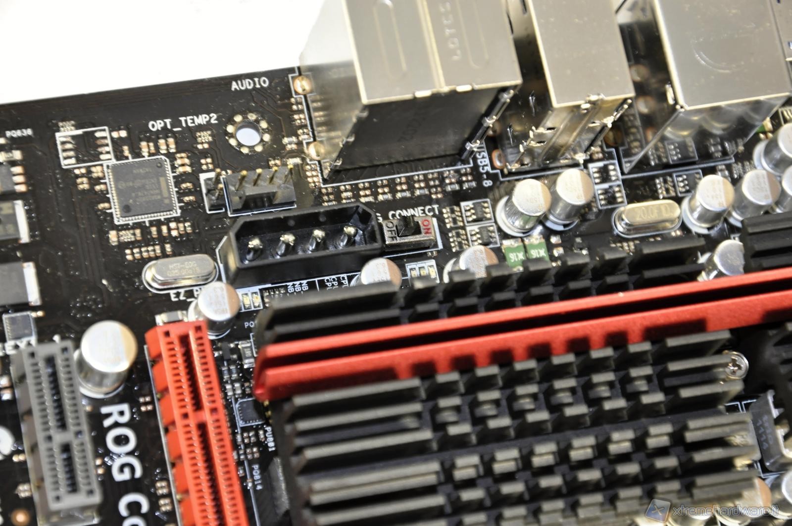 Proceeding to the left starting from the higher end of the motherboard you can see both the 4-pin molex connector for expansion slot power and the switch to activate/deactivate the ROG Connect connector.