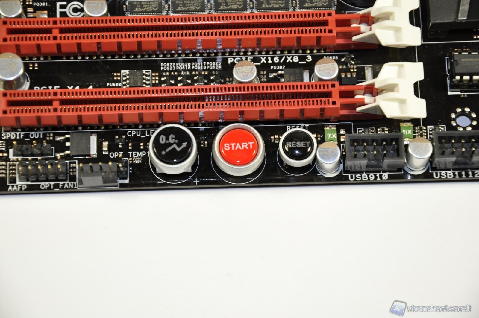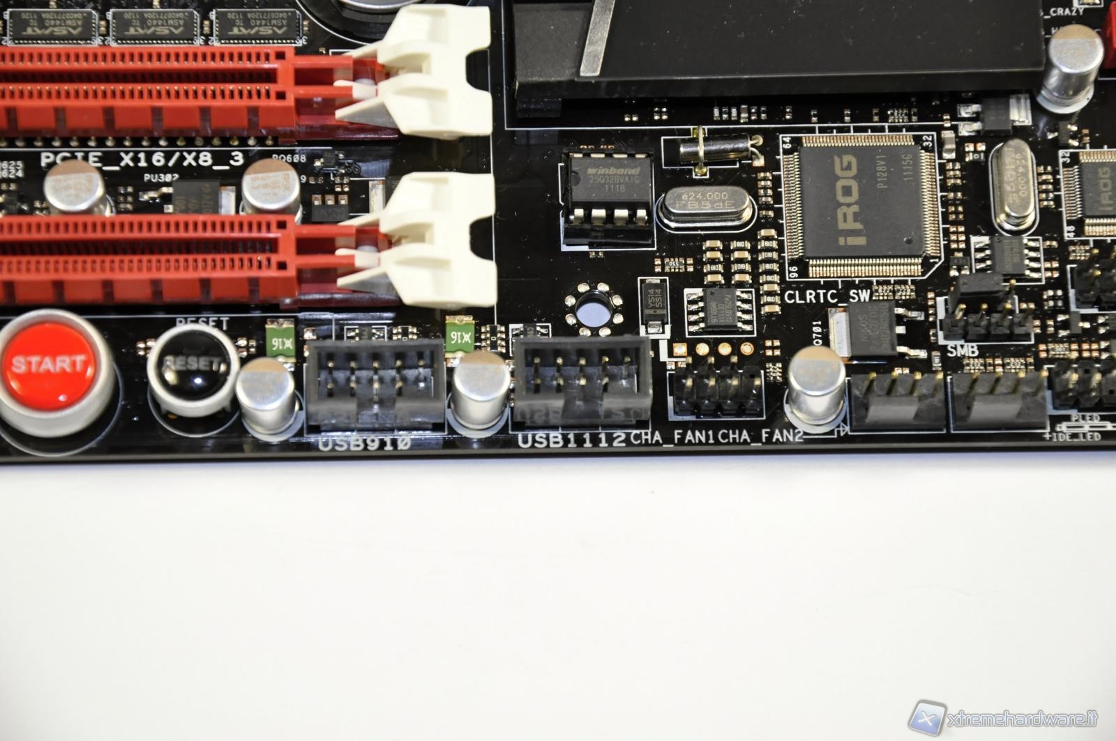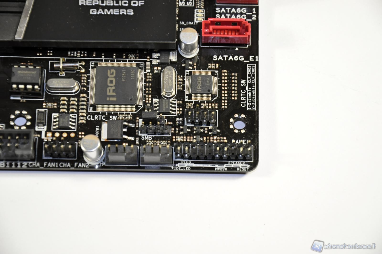 In the picture an elegant passive heat sink above the SB950 southbridge. Below, the support chip for iROG technology for system overclocking.