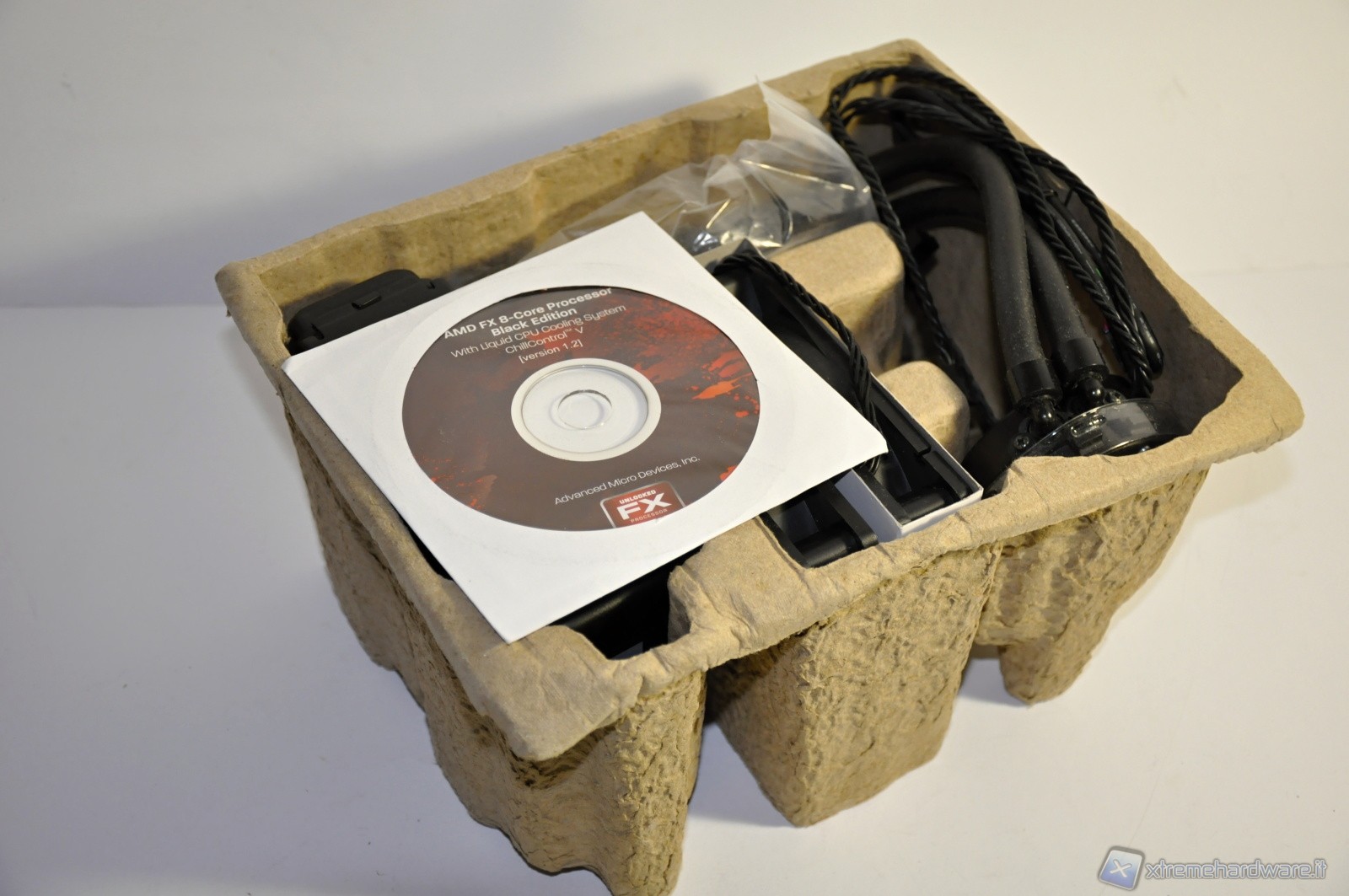 The version of the processor received in our labs was accompanied by the Liquid CPU Cooling System, just a kit supplied by AMD as an optional liquid cooling system in the sale of Bulldozer. This kit, of which we propose some photos, consists essentially of two objects: 120mm radiator and waterblock.