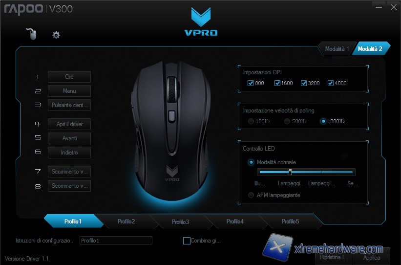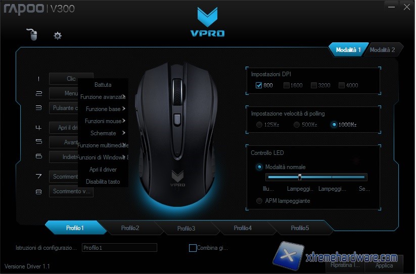 Nella prima schermata abbiamo subito la possibilità di modificare quasi tutti i parametri e funzioni relativi al mouse. Ricordiamo che il mouse è dotato di una memoria on-board per cui una volta salavate le modifiche e collegato il mouse su un altro PC avremo sempre gli stessi settaggi senza dover riscaricare il software per personalizzare le funzioni. Nel dettaglio troviamo una classica immagine del mouse dalla quale cliccando su diverse zone potremo vedere il numero corrispondente e a seguire nella parte sinistra assegnare funzioni base o avanzate o disattivare completamente il tasto nel caso fossimo amanti della semplicità. Spostandoci sul lato destro troviamo la possibilità di settare i DPI ed il Polling Rate. Per i DPI come vediamo abbiamo rimosso le altre risoluzioni e lasciato solo quella degli 800DPI. Ciò ci permetterà di lavorare con una sola risoluzione. Infine troviamo la voce “Controllo LED” dalla quale potremo personalizzare la retroilluminazione. Nel dettaglio potremo agire su quattro regolazioni “Illuminazione Spenta”, “Lampeggiante Lento”, “Lampeggiante Veloce” ed infine “Sempre Acceso”. Starà a noi scegliere quale settaggio impostare. Ricordiamo che la retroilluminazione è relativa al singolo colore arancione, unico colore disponibile. Non manca infine la possibilità di creare due Modalità differenti e di salvare fino a 5 profili differenti. Al solito il software ci permette di collegare il profilo ad un eseguibile di un gioco in modo da avere le impostazioni già caricate.