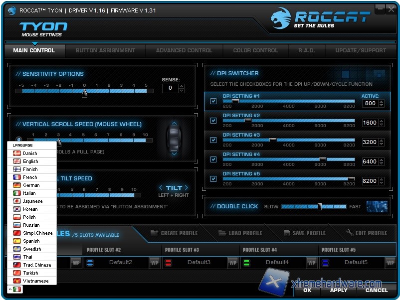 Avviato il software di gestione, avremo come sempre una grafica scarna di immagini ma ricca di impostazioni da regolare ed impostare a nostro piacimento, secondo gli utilizzi che faremo del mouse. La schermata principale, chiamata ‘’Main Control’’, è caratterizzata dalla presenza di diverse barre con slides che ci permetteranno di regolare la sensitività del mouse, la velocità di Scroll, i DPI ed i vari step e di creare ed editare i 5 profili disponibili. Non manca anche la regolazione della velocità della pinna/tasto presente sul dorso del mouse. I DPI potranno essere regolati solo a step di 200 e non di 50 o 100. Non crediamo sia un grave difetto per i classici videogiocatori. Non manca la possibilità di disabilitare gli altri step di DPI deselezionando la spunta in corrispondenza dello step. Per finire potremo anche cambiare la lingua del software di gestione che in questo caso è già settata in Italiano.