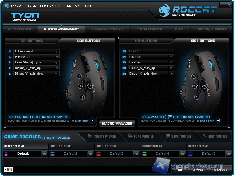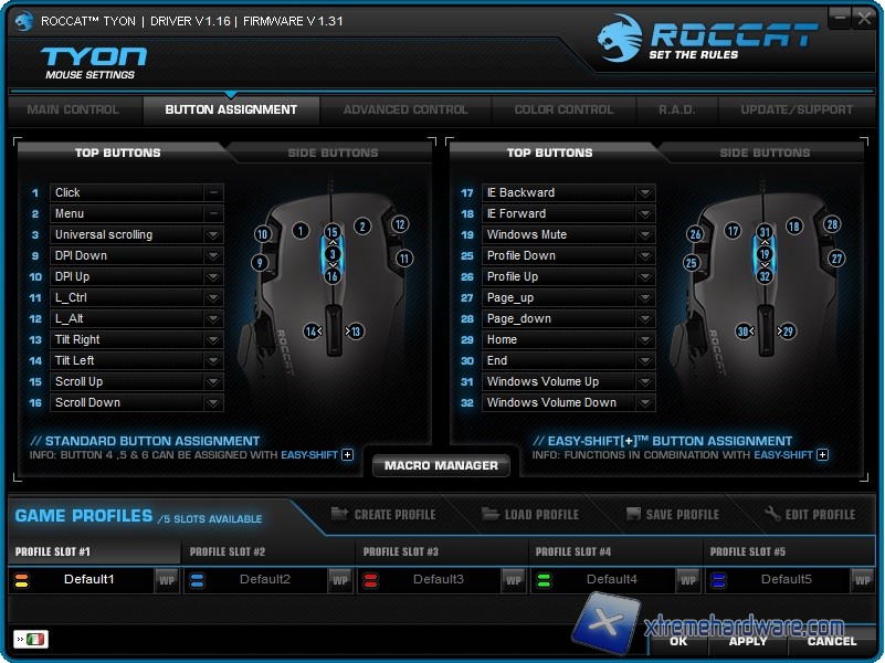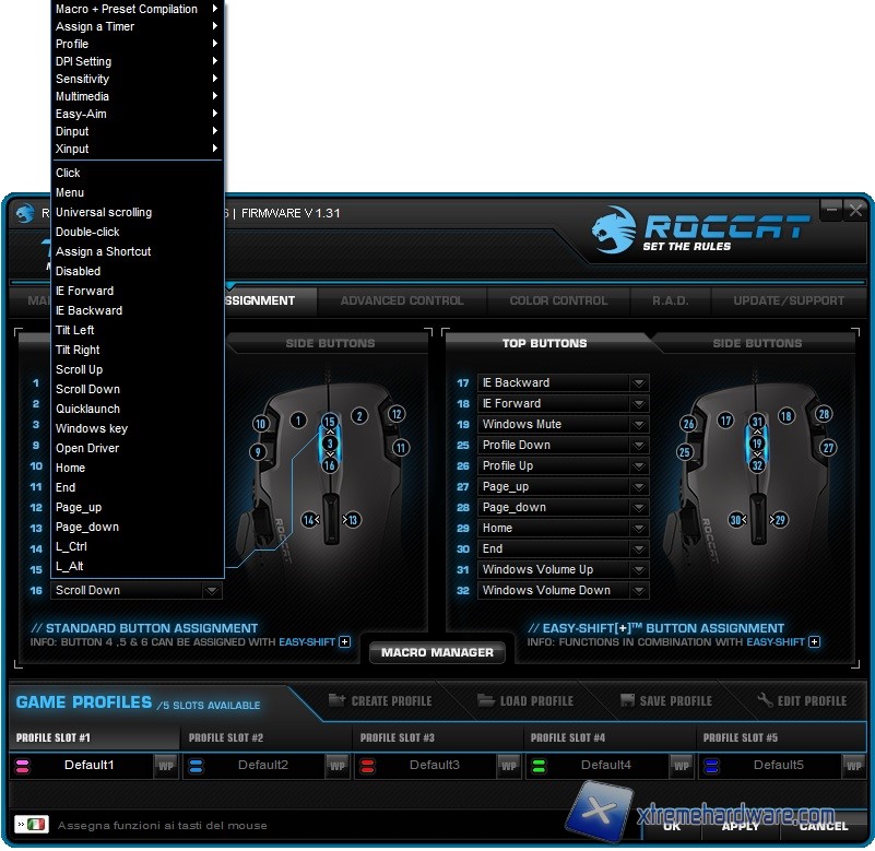 A seguire passiamo alla schermata/menù ‘’Button Assignment’’ dalla quale potremo assegnare a tutti i tasti presenti sul mouse diverse funzioni. Potremo creare Macro, assegnare funzioni multimediali e molto altro. Il Roccat Tyon è dotato di 16 tasti fisici che potranno essere raddoppiati a 32 in modo virtuale tramite la pressione del tasto speciale EasyShift+ più il tasto di nostro interesse.