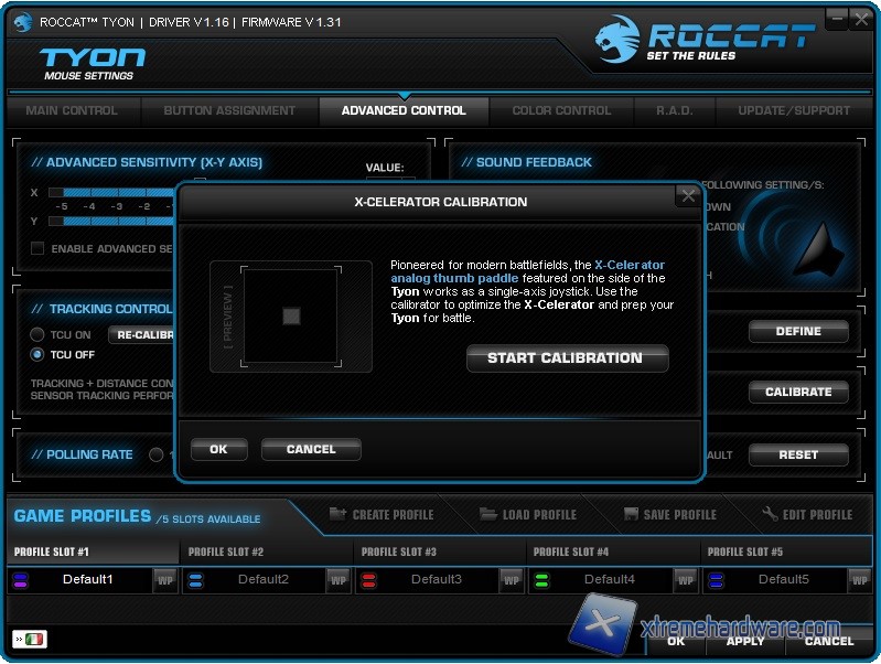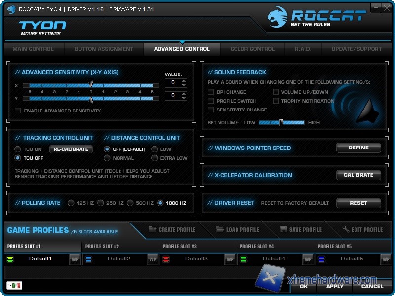 Il Menù successivo ‘’Advanced Control’’ ci permetterà di accedere alle funzioni tecniche del mouse e sensore modificando il Polling rate, il LOD, la calibrazione della levetta X-Celerator, la velocità del puntatore di Windows e molto altro. Non manca come da tradizione Roccat i suoni per quando si cambieranno determinate impostazioni come i DPI, i profili, il raggiungimento di un obiettivo con relativo trofeo e molto altro.