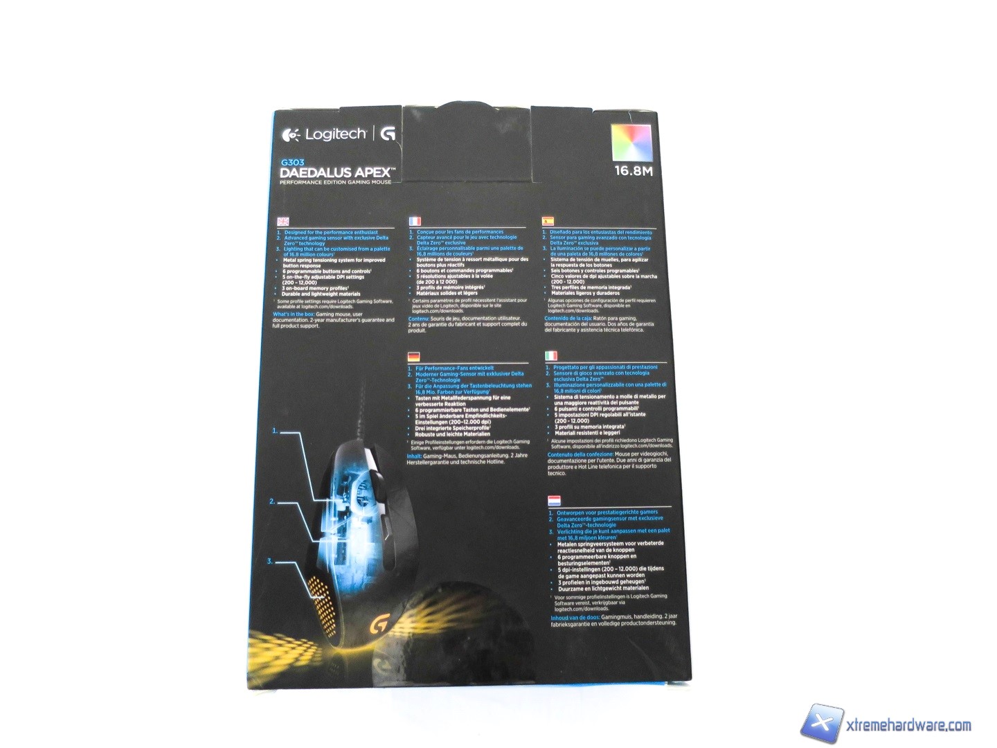 La confezione del Logitech G303 Daedalus Apex richiama i colori della ormai famosa serie Gaming di Logitech e protegge abbastanza bene il prodotto. Anche se lo spessore del cartone è ridotto, internamente è presente una ulteriore protezione in plastica rigida. Informazioni ed immagini del prodotto al solito non mancano.