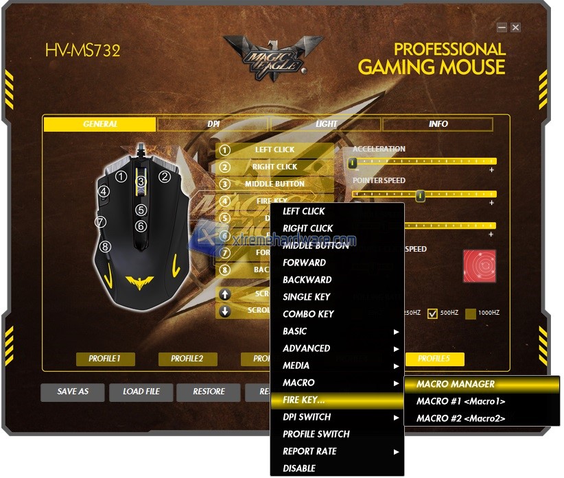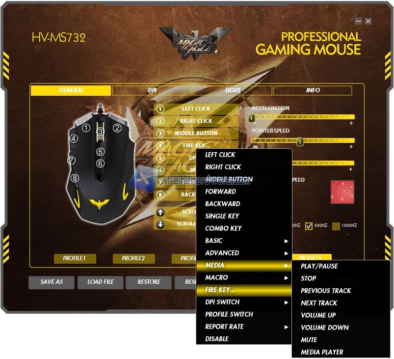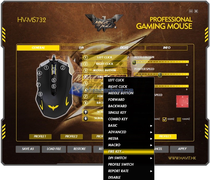 Fatto ciò ed aperto il software ci troviamo di fronte una grafica personalizzata ma spartana con tutte le voci e funzioni a portata di click e divise come sempre in diversi Menù. Nel primo Menù ‘’General’’ troviamo la classica immagine del mouse con i diversi numeri che ci indicano i tasti complessivi presenti sul mouse e la relativa posizione per eventualmente modificare qualche opzione o assegnazione rispetto a quella di default. Infatti a lato possiamo, cliccando con il tasto sinistro, scegliere tra le più svariate opzioni di personalizzazione. Tra i tasti troviamo il numero 4 (il tasto giallo fisico sul mouse) a cui è di default assegnata la funzione Rapid Fire impostabile a seconda delle nostre necessità. Nel Menù ‘’Generale’’ troviamo comunque altre impostazioni quali accelerazione, doppio click, Polling Rate e così via modificabili nonché la presenza di 5 profili personalizzabili e caricabili On-The-Fly tramite i tasti presenti sul mouse.