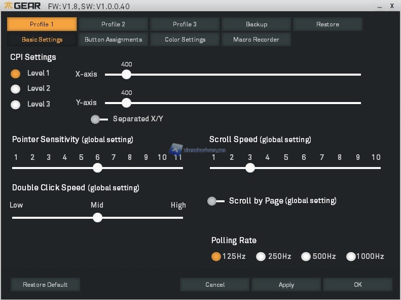 Nella parte centrale e inferiore del Menù ‘’Basic Settings’’ troveremo le più classiche impostazioni per modificare i DPI dei tre livelli impostabili, velocità del doppio click, dello scroll, valori del Polling Rate e cosi via. Sinceramente non manca niente a differenza del settaggio relativo al Lift Off Distance che durante i test abbiamo notato comunque essere nella norma.