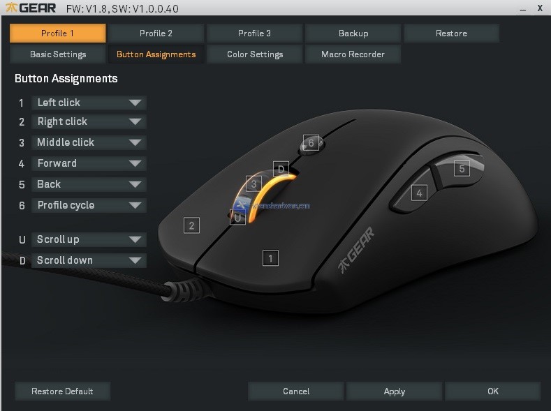 Nella parte alta troviamo i 5 Profili che potremo personalizzare da tale software di gestione e alcune voci che ci permetteranno di effettuare un Backup, un Restore dei profili salvati, un ripristino ai parametri di fabbrica in caso di problemi e i classici tasti per confermare o meno le modifiche. Insomma tutto ciò che abbiamo già visto con la tastiera RUSH.