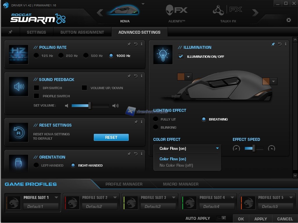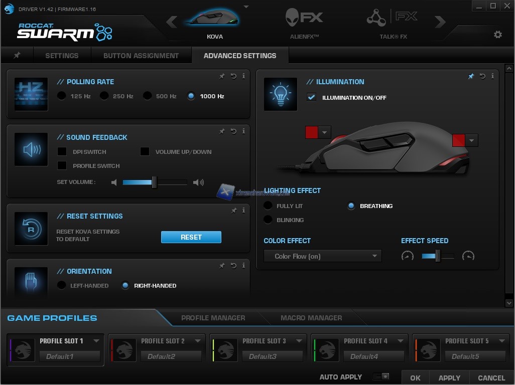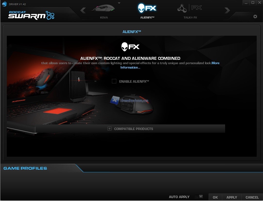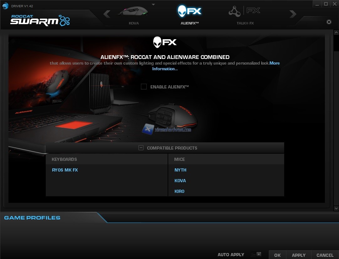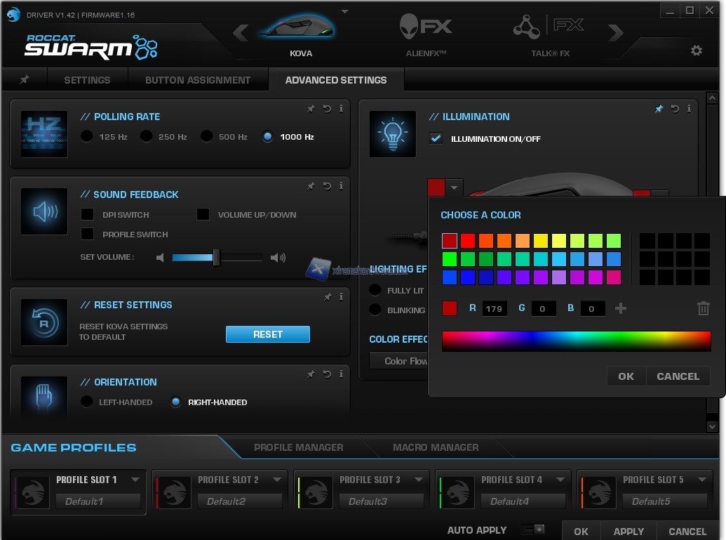 ROCCAT come visto anche in altre nostre recensioni mette a disposizione anche alcune funzioni avanzate quali ‘’AlienFX’’ che ci darà modo di creare un sistema unico di retroilluminazione con i PC Desktop o Notebook Alienware. La compatibilità di tale funzione è al momento relegata tramite il software Swarm alle periferiche che abbiamo citato prima.