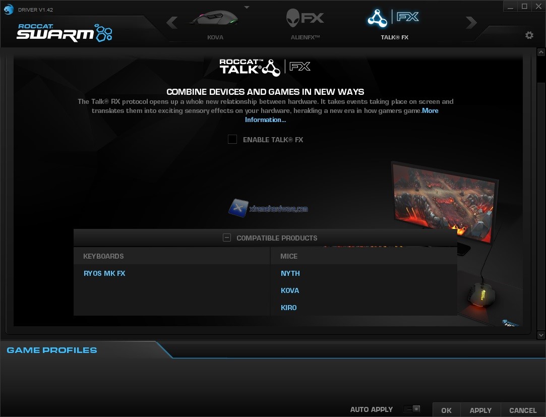 Da progetto nascente a funzione funzionante a tutti gli effetti ecco anche la funzione ‘’TalkFX’’ di ROCCAT che ci darà modo di mettere in comunicazioni scene di gioco con effetti visivi di retroilluminazione delle periferiche compatibili. Potremo ‘’legare’’ un gioco in modo che ad ogni esplosione, effetto la retroilluminazione del mouse e della tastiera risponda allo stesso modo e tempo.