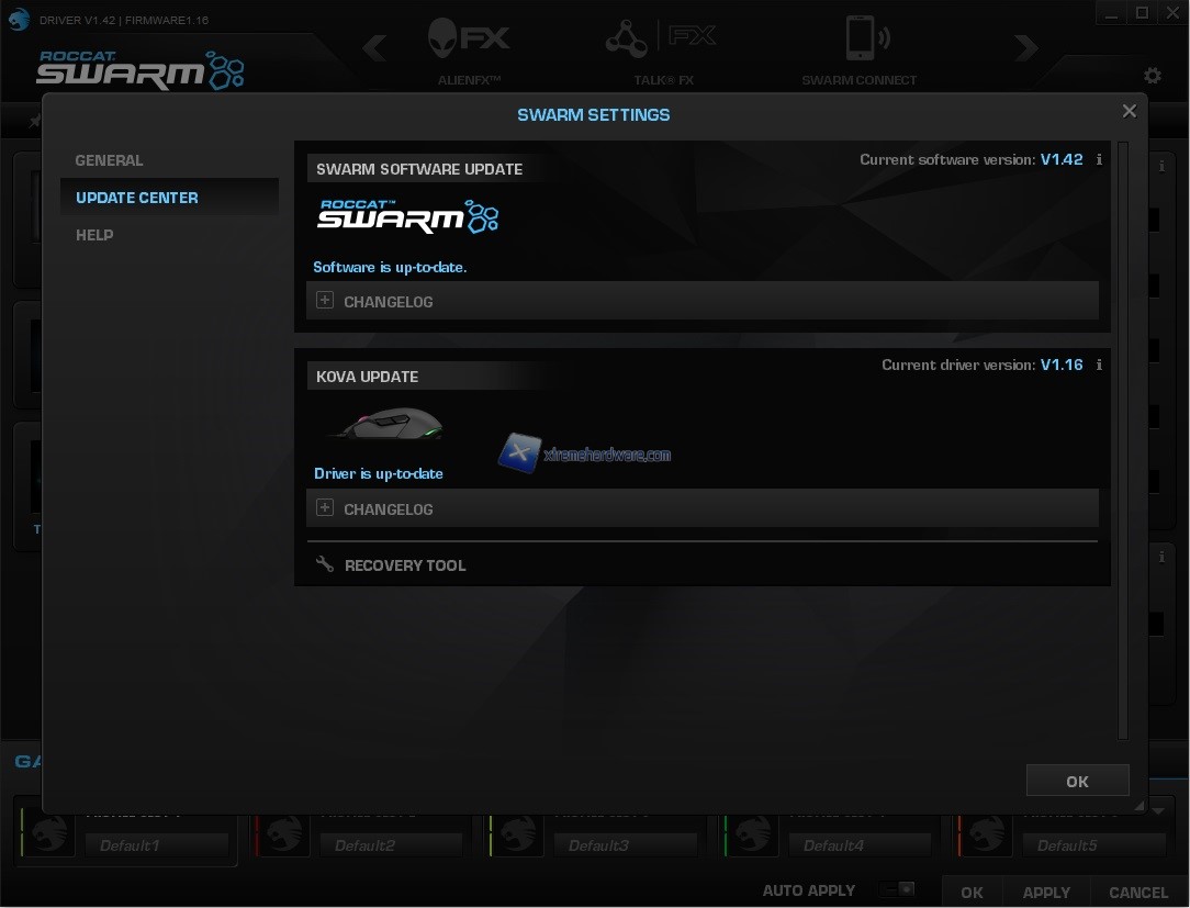 Il software di gestione ROCCAT Swarm si conclude con un Menù per la gestione e controllo dei dispositivi connessi e compatibili e la relativa disponibilità di aggiornamenti. Potremo controllare anche tutti gli eventuali Change-Log per i nuovi aggiornamenti. Viene messo a disposizione anche un Recovery Tool in caso di problemi dovuti ad un nuovo aggiornamento o malfunzionamento della periferica. Potremo inoltre cambiare lingua di visualizzazione.
