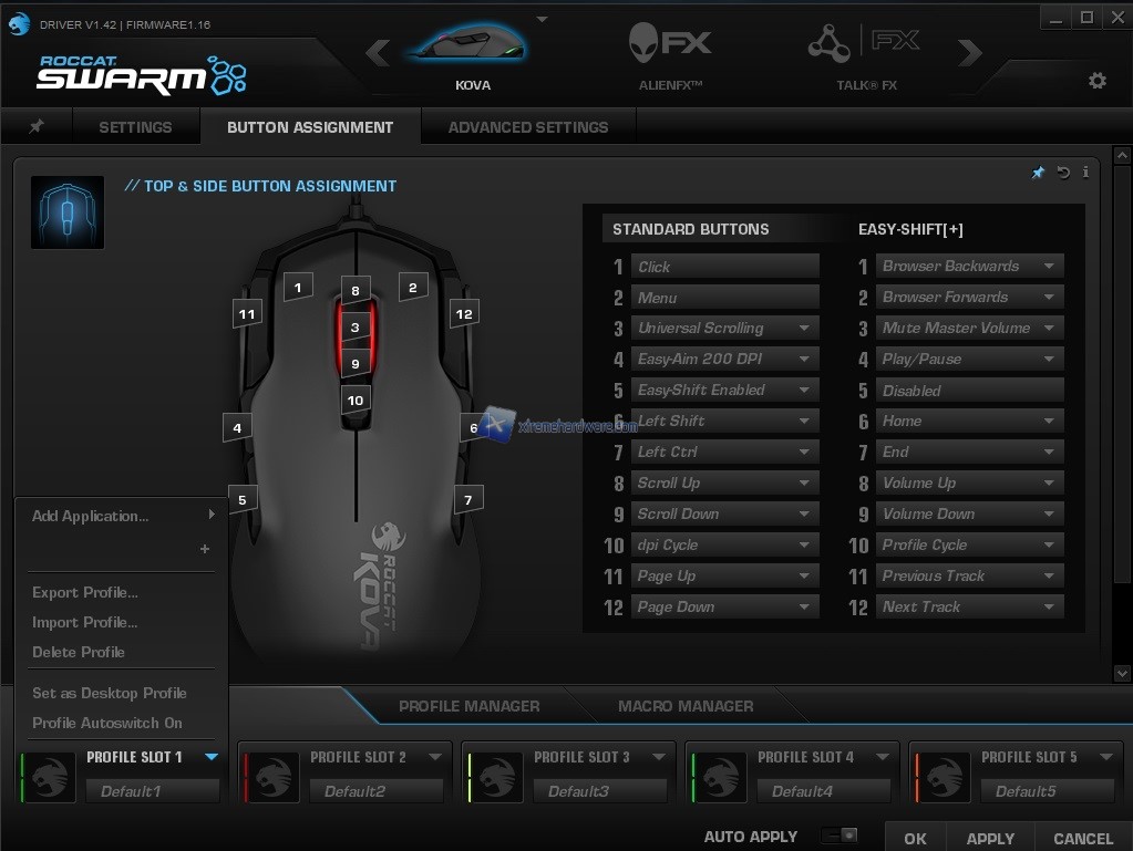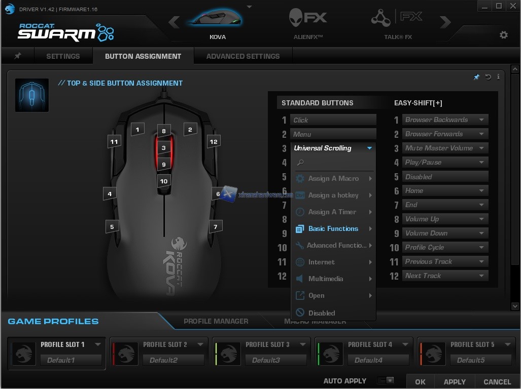 Tornando invece alla gestione dei tasti del mouse e precisamente nel Menù ‘’Button Assignment’’ come vediamo troveremo sempre un’immagine tridimensionale del mouse e a lato sia i 12 tasti principali sia quelli raddoppiabili grazie alla funzione ROCCAT EasyShift+. I diversi tasti potranno essere assegnati con funzioni multimediali, Macro, Browser e molto altro ancora.