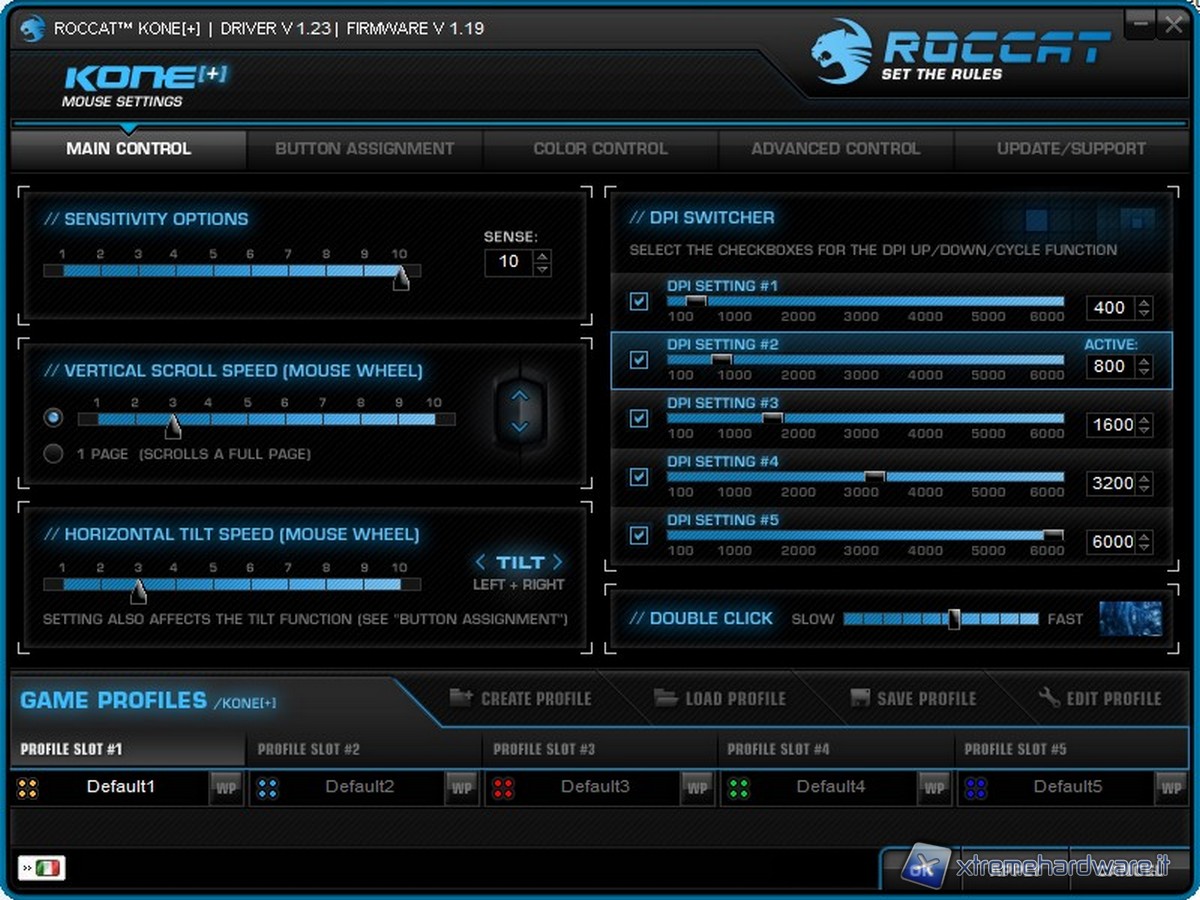Nel quarto tab passiamo alle impostazioni avanzate, tramite le quali potremo impostare la sensibilità per ogni asse del mouse (X,Y), la velocità di puntamento in windows e le impostazioni di volume in corrispondenza di alcuni settaggi particolari, come quello dei DPI. E' possibile inoltre resettare tutte le impostazioni.