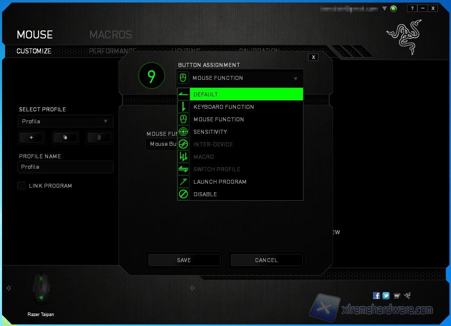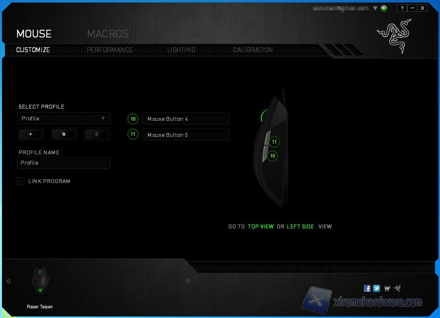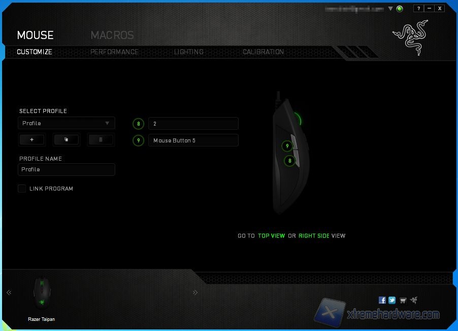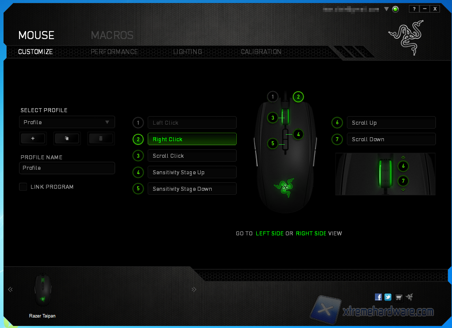 La schermata principale per il Taipan è dedicata alla configurazione dei tasti. I tasti laterali del mouse sono raggiungibili mediante left side e right side. Selezionando poi un pulsante è possibile indicare il tipo di azione da eseguire, sono molteplici le voci selezionabili, da quelle di base del mouse, controllo del sensore, replicazione di un tasto fino alle macro create con l'apposito strumento all'interno del software.