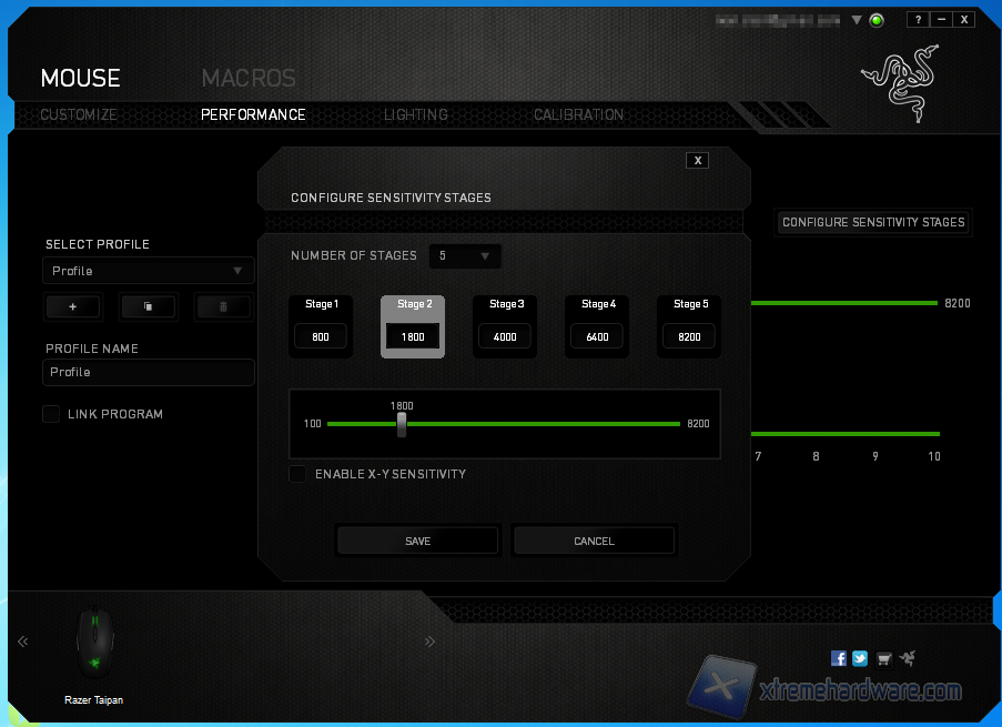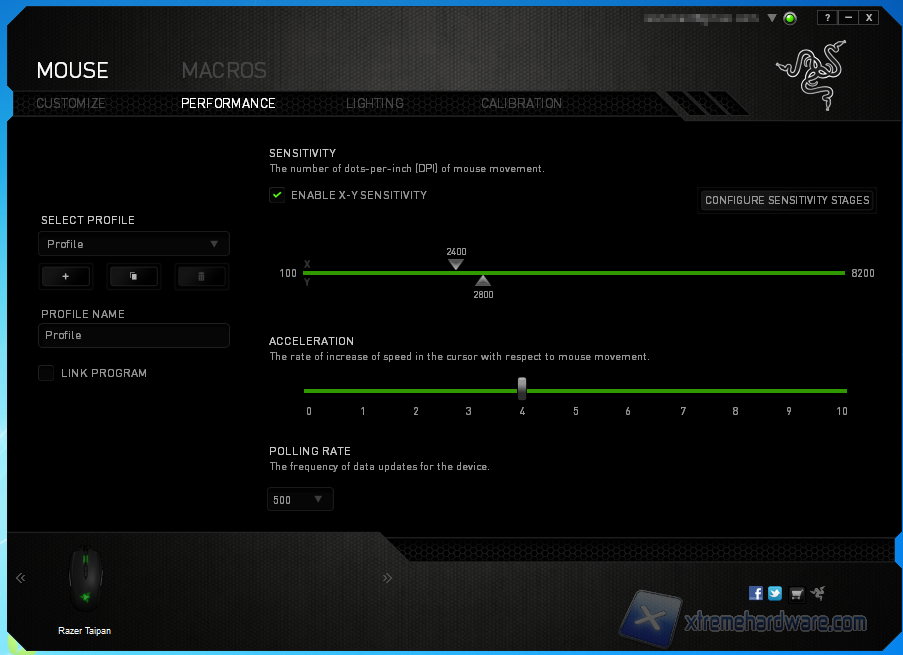 La seconda tab, PERFORMANCE, è dedicata alla configurazione del sensore. È possibile regolare il sensore secondo assi indipendenti, regolare l'accelerazione del mouse e definire la risoluzione per i vari step (al massimo 5). Anche la regolazione dell'ultrapolling è accessibile da questa schermata; le configurazioni attuate vengono associate al profilo indicato.