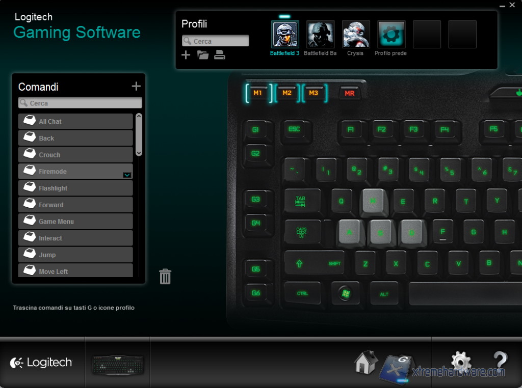 Se clicchiamo sulla tastiera presente nel software, la visuale si stringe sui tasti M e G e il programma apre una piccola lista, nominata “Comandi”, sulla sinistra dello schermo. Questa lista ci permette di selezionare un’azione e trasportarla con il mouse sul tasto G che si vuole programmare.