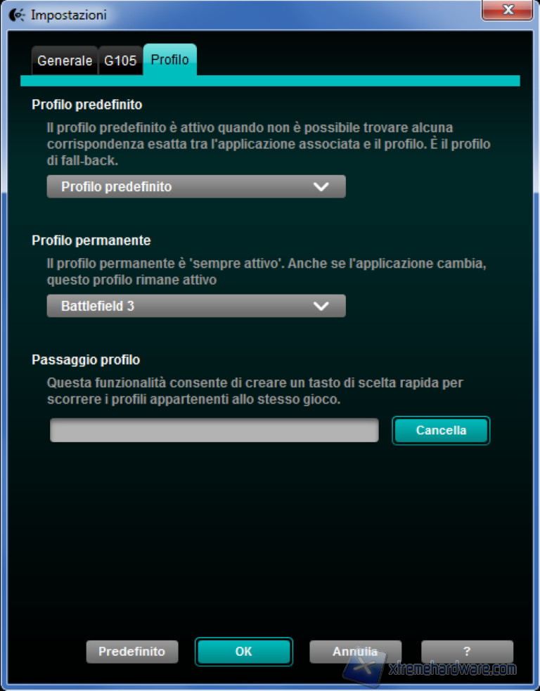 Si aprono dopo il click tre sottomenu, il primo riguarda tutte le impostazioni generali, ad esempio possiamo scegliere se fare eseguire o no al software la scansione dei giochi che all’inizio abbiamo accennato. Il secondo menu ci mostra solamente il firmware installato, che nel nostro caso è lo 0x7310. L’ultimo menu invece riguarda l’impostazione dettagliata dei vari profili, possiamo scegliere il profilo permanete e quello predefinitivo.