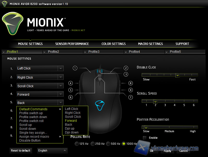 Mouse Setting è la prima schermata che ci appare davanti aperto il tool di configurazione, da qui principalmente possiamo mappare i 9 pulsanti programmabili del mouse, potendo scegliere tra le funzioni tipiche di un mouse, switch dei profili o della risoluzione del sensore, assegnazione di un singolo tasto o di una macro e l'inibizione del tasto stesso. È presente anche il controllo del polling rate oltre che all'accelerazione del mouse, velocità dello scroll e del doppio click. Da notare, infine, la possibilità di gestire 5 profili.