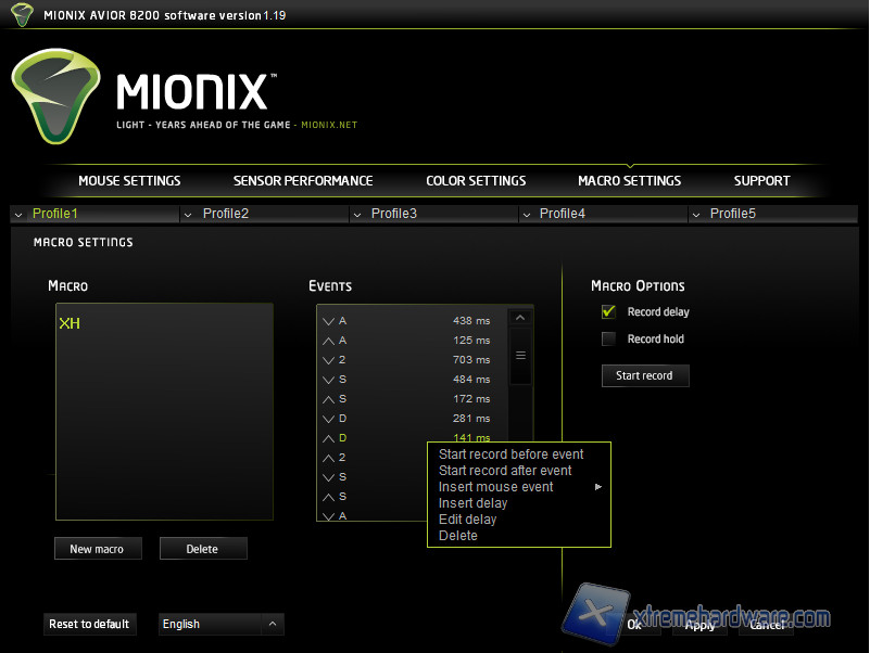 Macro settings è un semplice tool che ci permette di creare le macro. Assegnato il nome alla macro, potremo inserire la successione di comandi dopo aver premuto il tasto start record, scegliendo se salvare o meno i delay reali.